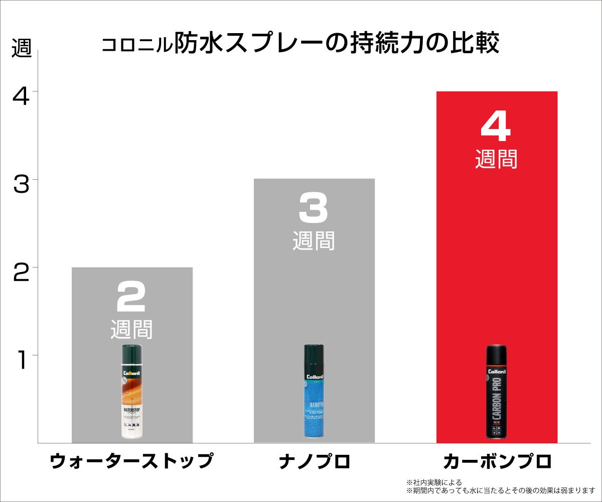 従来のコロニルを代表する汎用性の高い防水スプレー「ウォーターストップ」の効果持続期間は約2週間※。2007年に登場した防水スプレー「ナノプロ」は約3週間※の持続力とより強力な撥水力で世界中から信頼される商品となりましたが、カーボンプロはこれを更に上回り、なんとその効果は約4週間※持続します。カーボンプロの特徴的な保護膜がこの持続力の秘訣です。