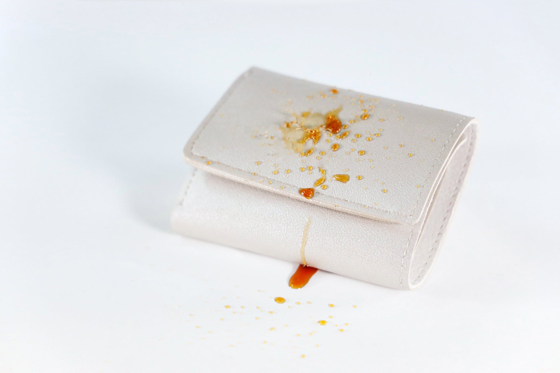 「白いレザーのバッグ、キャンバスのバッグ」「ヌメ革のお財布」「パンツ裾の泥はね」