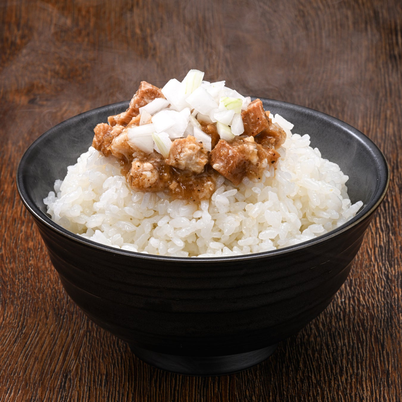 盛り付けられた生の刻み玉ねぎが特徴です。