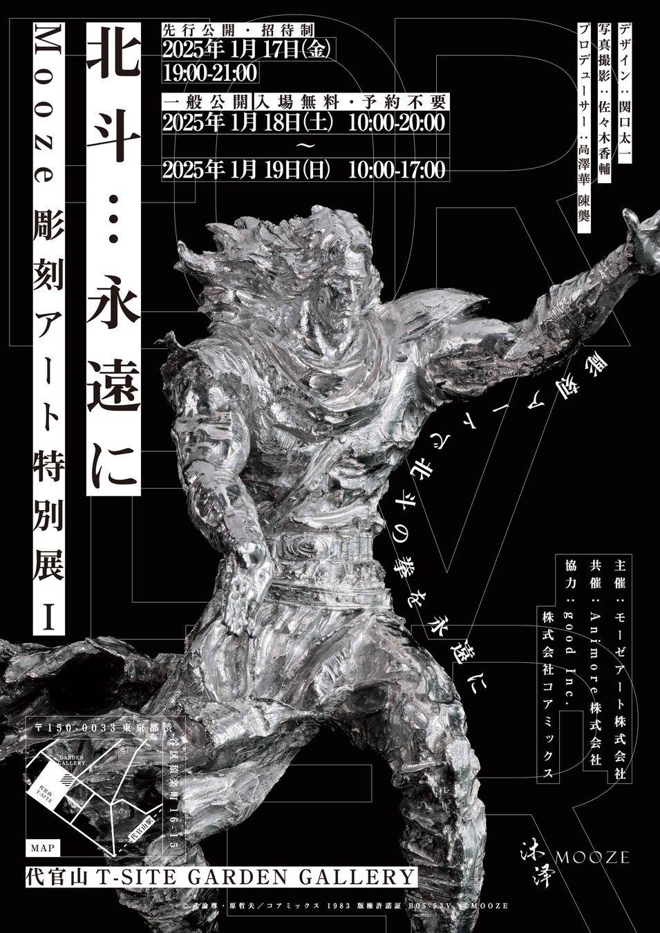彫刻アートの新ブランド「Mooze」の展示会を、2025年1月中旬に代官山T-SITE GARDEN GALLERYにて開催いたします。今回の初展示では、Moozeの創始者である高澤華氏が大ファンである北斗の拳を彫刻で表現します。「彫刻アートと日本の人気コンテンツとの出会い」をコンセプトとして、来場者の皆様に新たな視点での作品鑑賞をご提供いたします。