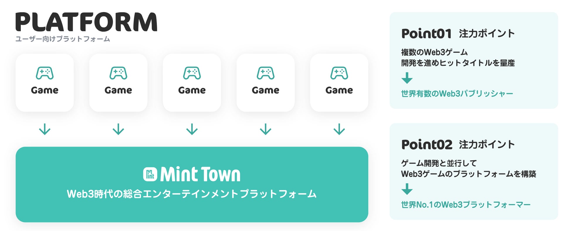 株式会社Mint Townは、Web3ゲーム・Web3ゲームプラットフォームを手がける事業会社です。日本のみならず、シンガポールとドバイにも子会社を設立し、Web3ゲーム・Web3ゲームプラットフォームの企画・開発・運営を行っています。現在は2023年1月にリリースした『キャプテン翼 -RIVALS-』の運営を行っています。今後もWeb3ゲームのマスアダプション化に向けて、日本から世界に向けて新たなエンターテインメントを提供していきます。