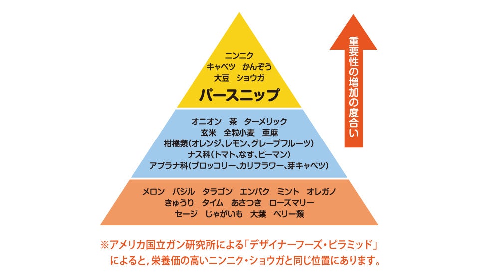 パースニップは白いニンジンのような見た目で欧米ではスーパーフードとして親しまれている栄養価が高いセリ科の根菜です。垂水大同青果株式会社は、桜島の降灰や天候の影響を受けにくい野菜を新たに作ろうと5年前から栽培を始め、鹿児島大学の研究グループが食物繊維やビタミンなどがほかの根菜類と比べて豊富であることを明らかにしました。また、アメリカ国立がん研究所が、がん予防に効果があると考えられる約40種類の食品を、効果が期待できる順に上からピラミッド型に並べた「デザイナーフーズ・ピラミッド」でも上位に位置します。一方で、栽培が難しく規格外品が多く出ることも課題でした。
