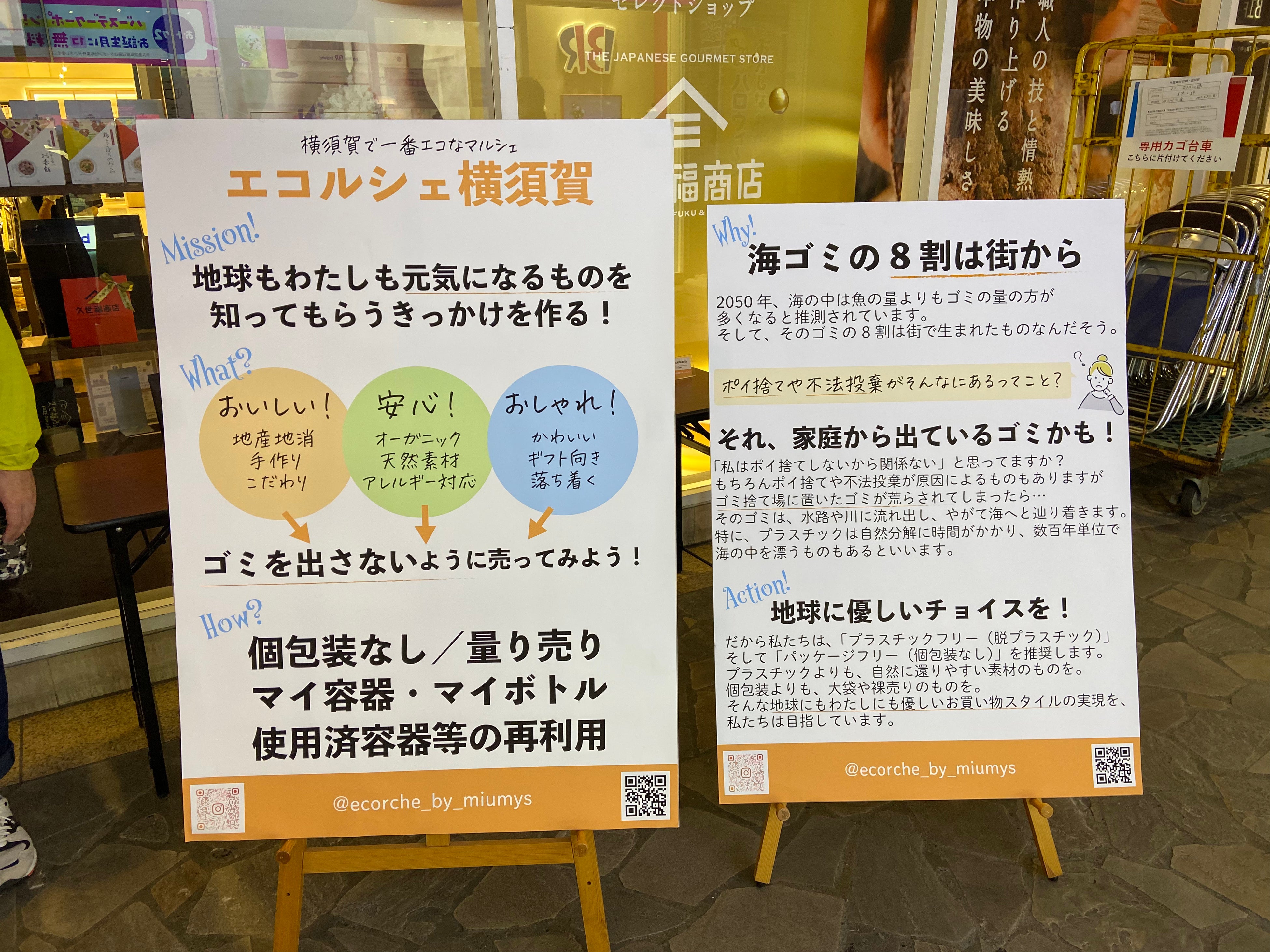 「エコルシェ横須賀」は「地球もわたしも元気になるマルシェ」をコンセプトに、「なるべくゴミを出さない売り方の横須賀で一番エコなマルシェ」を目指して、2021年4月より月に一度横須賀市佐島にて開催。量り売りのドライフルーツや食材、素材や生産過程にこだわった地球に優しいサステナブル製品を販売する。来場者にマイ容器の持参を呼びかけ、過剰な梱包の削減やイベント時に発生するゴミの削減を呼びかける。