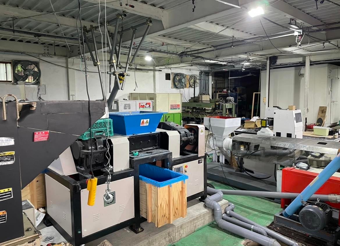 工場内にプラスチックの粉砕、洗浄、比重分離、乾燥、独自開発の成型機などリサイクルに必要な全ての設備を備えており、混合プラスチックの粉砕からリサイクル品の製造までを一気通貫で実施することが可能。