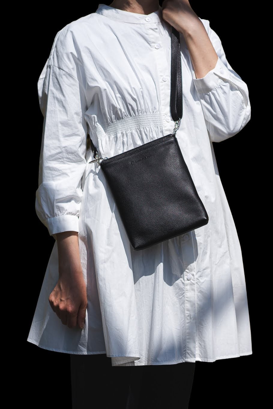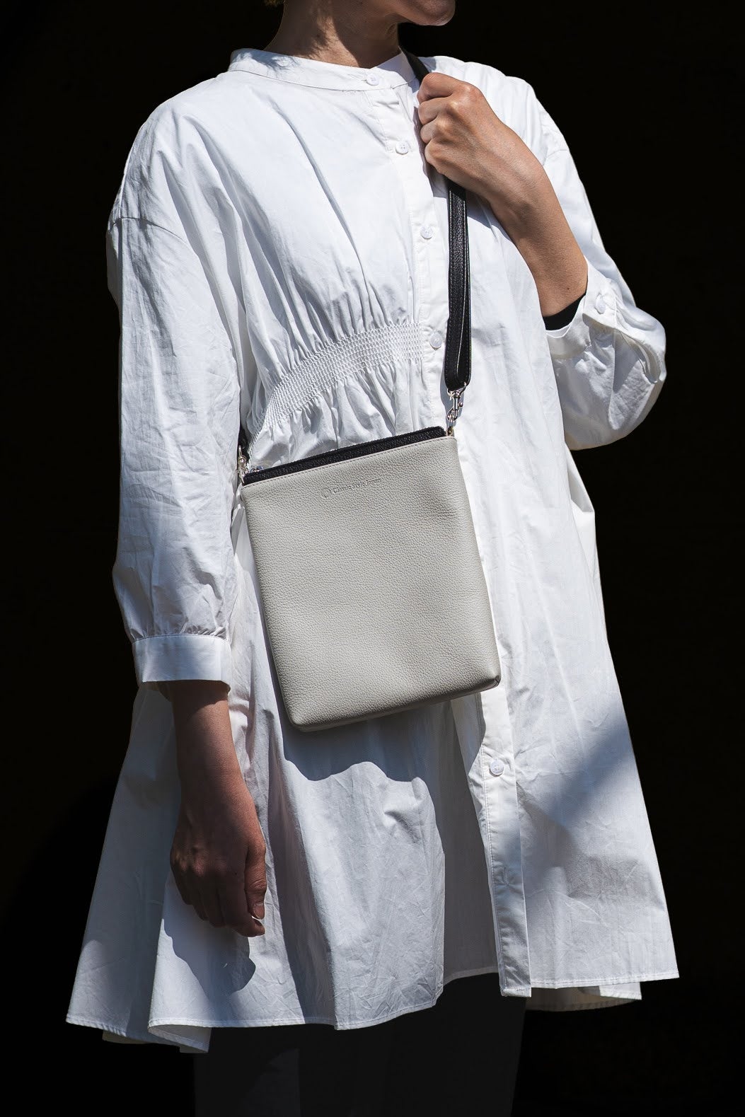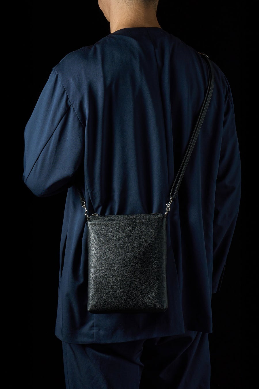 モード系にもカジュアル系にも違和感を与え無いように、ショルダーストラップの幅を1.5cmに設定し、スタイリッシュに仕立てました。