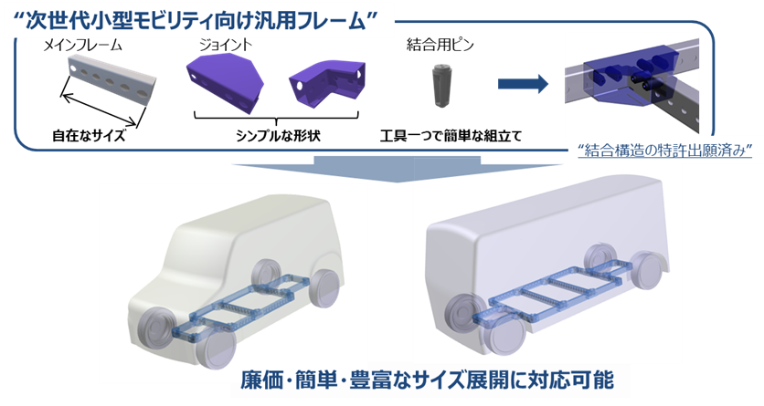 当社では、環境問題等の対策として今後需要が拡大すると見込まれる小型EVなどの次世代小型モビリティ向けに、設計や組立の初期コストを大幅に削減することができる汎用フレームを開発しました。従来の車体フレームは、クルマのモデルごとに専用の設計や製造設備が必要です。そのため、多用途かつ多種類な小型モビリティでは、1台当たりの設計費用や製造費用が高くなり、このことが低価格化を目指すにあたっての課題となっています。また、設計や製造に係る初期投資は、新たにモビリティ事業に参入する事業者にとっては負担が大きく、これらも小型モビリティの普及の障壁になっています。このような背景から、当社では、次世代小型モビリティ向けの汎用フレームを開発しました。本製品は、当社が独自開発した簡易結合技術を用いることで、溶接等を使用せず簡単に標準部品を連結してさまざまな形状のフレームを組み立てることができ、車体の設計や組立に係る費用と時間を削減することができます。当社は、今後さらなる製品・サービスの改良を進め、本製品が小型モビリティ用フレームのスタンダードとなるよう、一層の普及を目指してまいります。
