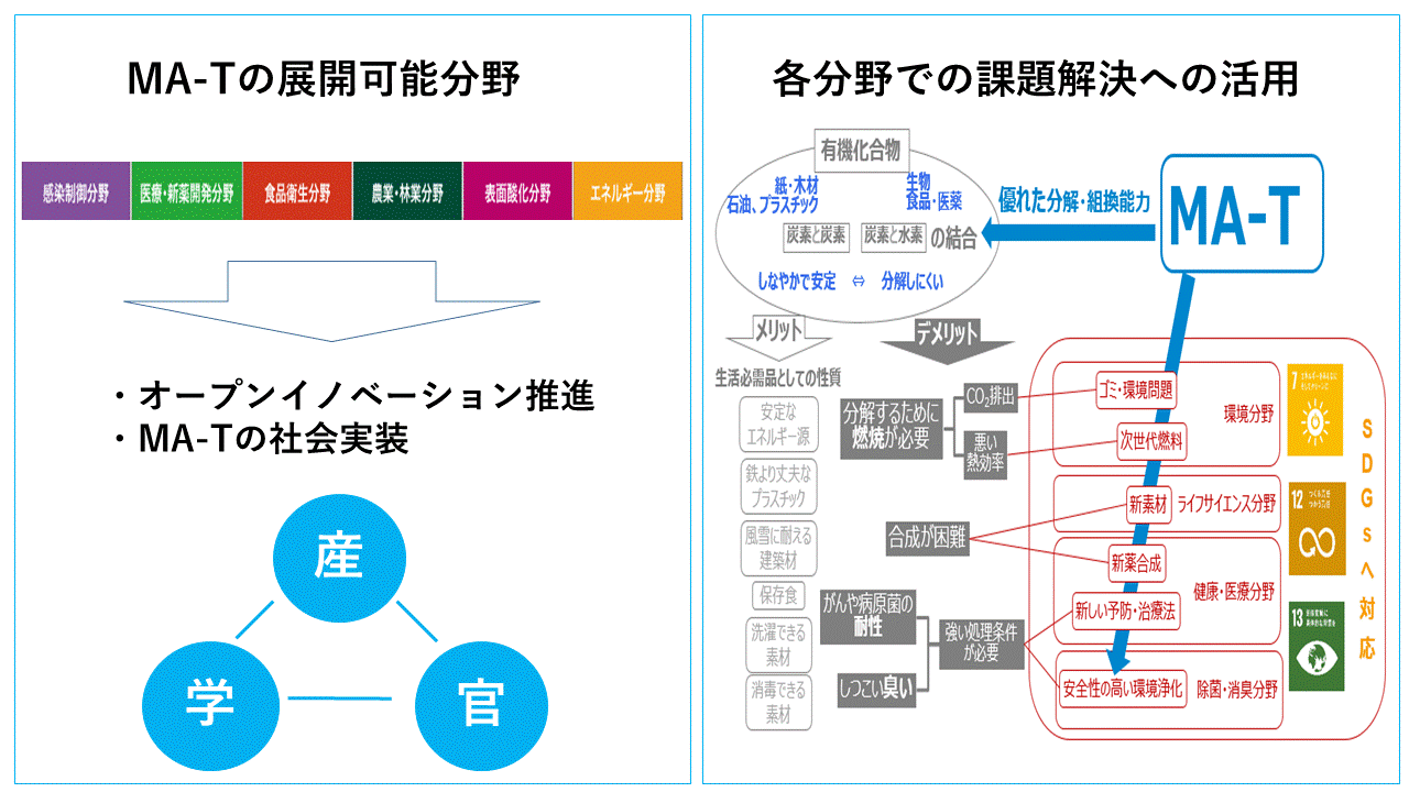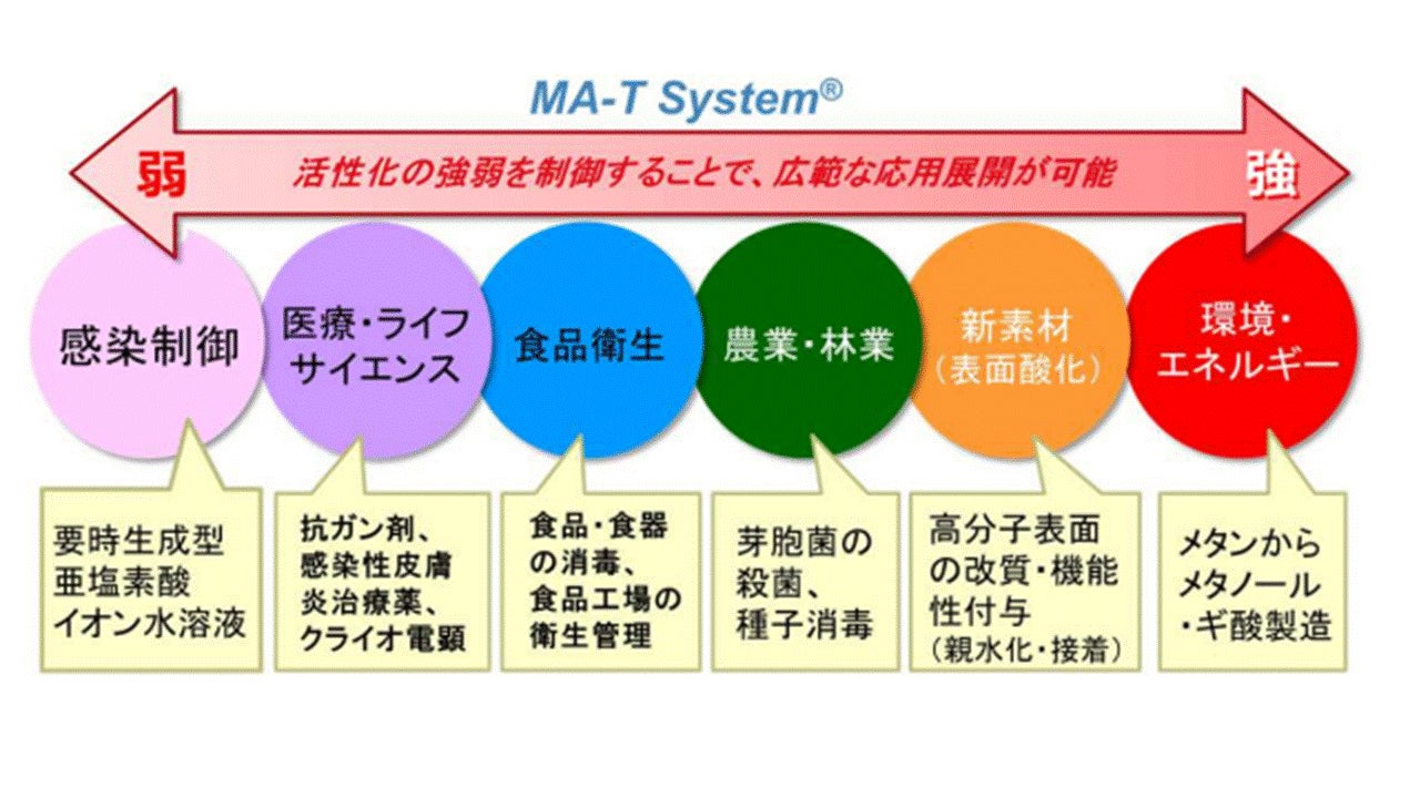 MA-T®の応用展開として、感染制御、医療・ライフサイエンス、食品衛生、農業・林業、エネルギー、表面酸化(マテリアル)の6つの分野を中心に開発を推進し、社会実装を進めている。日本MA-T工業会への加盟企業104社、賛助会員13団体。MA-T®に関連する大学発ベンチャーが2社起業(dotAqua、HOIST)