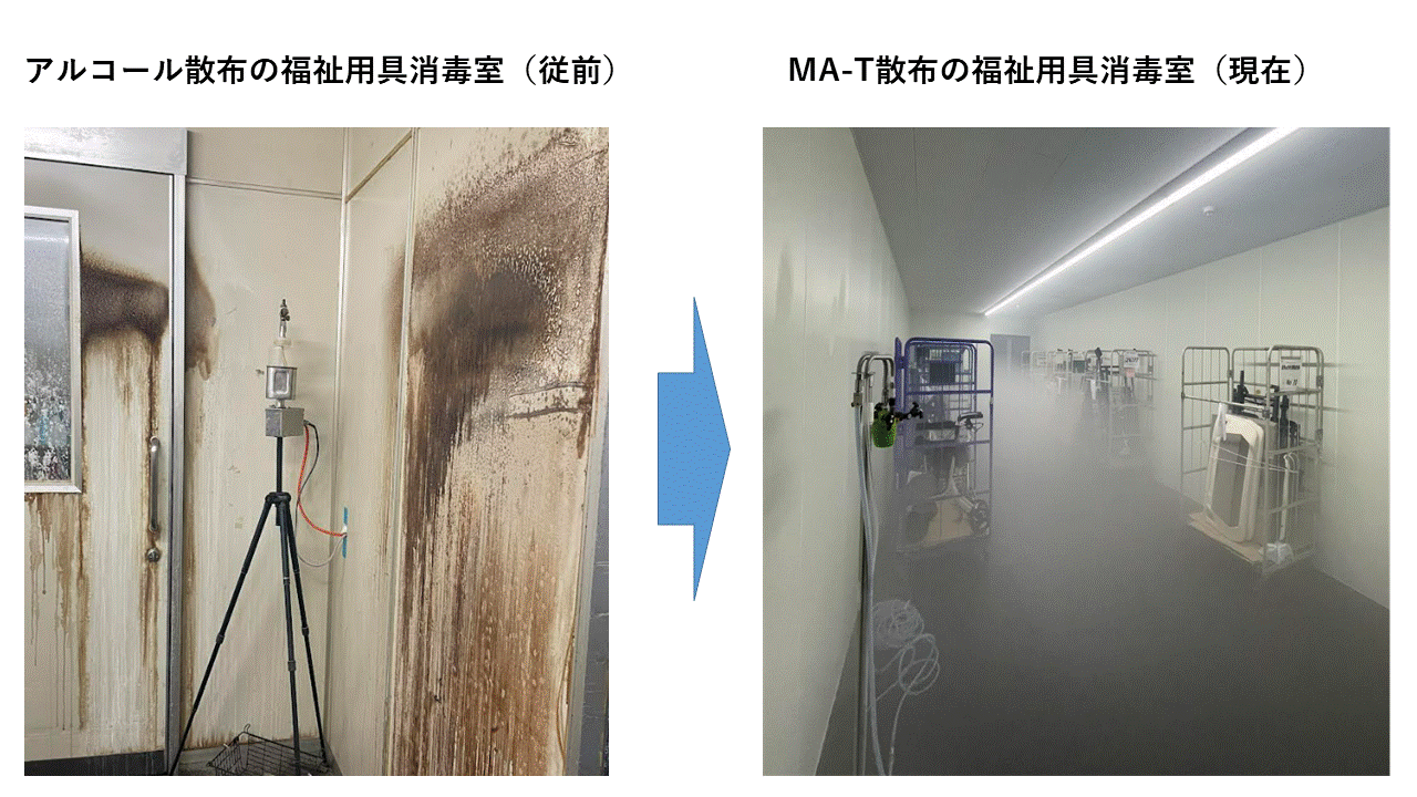 福祉用具のレンタル事業にてユーザーから返却された介護用品の受入時に自社消毒室にてアルコール噴霧により消毒を実施していました。MA-T®の散布開始により今まで課題であった「アルコール(可燃性ガス)噴霧による危険性」・「部屋の壁面のダメージ」・「噴霧するための可燃ガス使用」等様々なリスクからの回避実現。