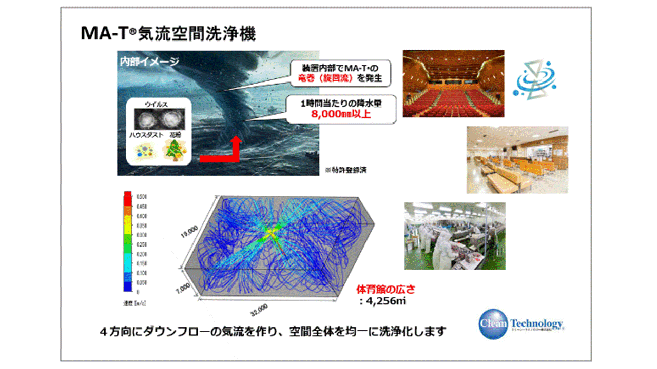 国内外の半導体工場に独創的な排ガス処理装置を送り出すメーカーであり、現在MA-T®を活用した装置開発に取り組んでいます。同社の持つ粉塵処理技術に、MA-T®の機能を加え、新しいコンセプトとなる「MA-T気流空間洗浄機」の社会実装を目指しています。