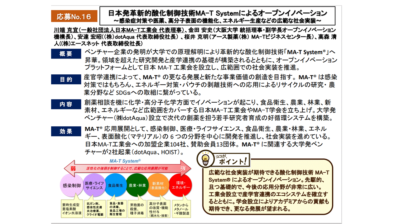 ベンチャー企業の発明が大学での原理解明により革新的な酸化制御技術「MA-T System®」へ昇華。領域を超えた研究開発と産学連携の基礎が構築されるとともに、オープンイノベーションのプラットフォームとして日本MA-T工業会を設立し、広範囲での社会実装を推進。