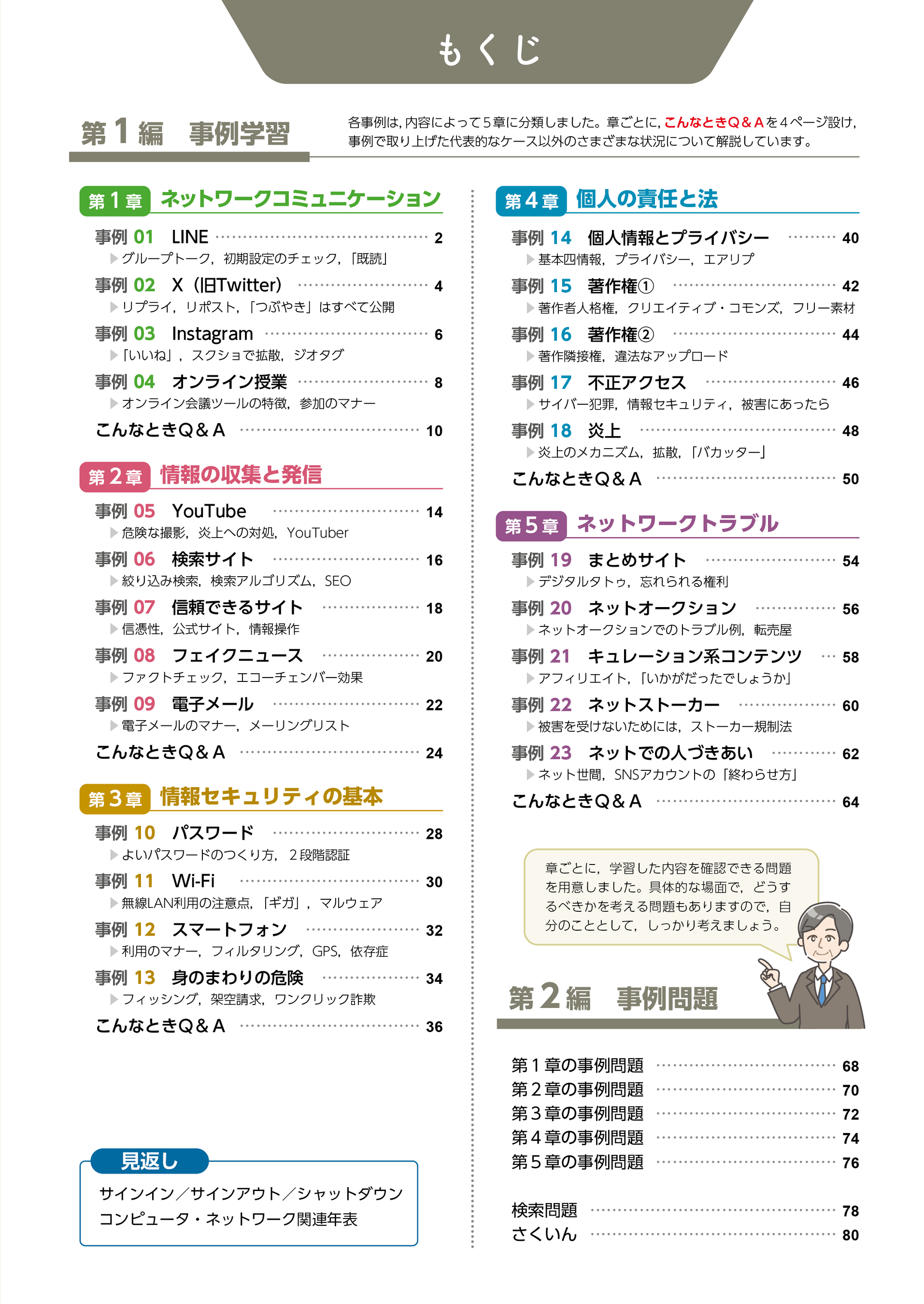 SNSなどでの情報の収集や発信において、他人の権利を侵害したり、心を傷つけたりすることがないようにするための基盤となる考え方を、情報モラルといいます。この書籍では、23の事例を通じて、情報モラルの考え方を網羅できるようにしています。また、その背景にあるしくみや事情などにもふれています。