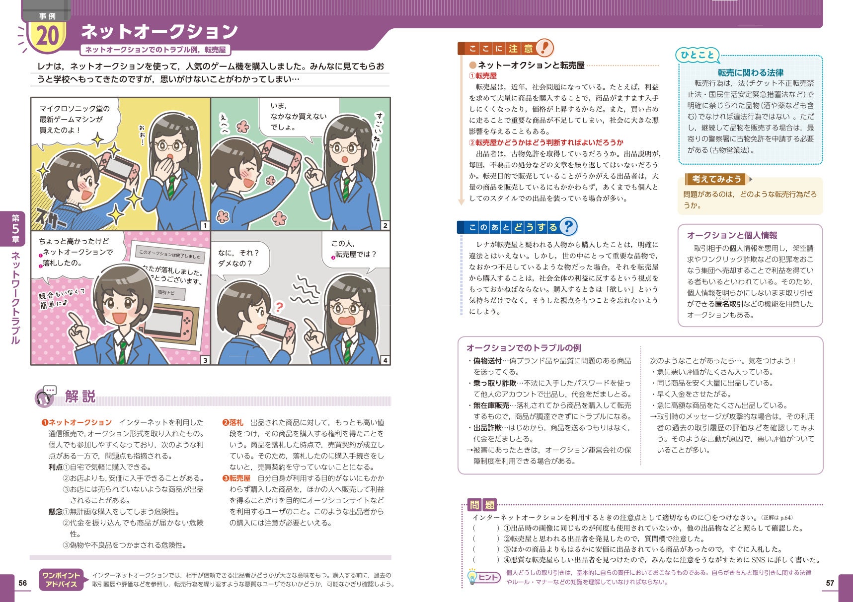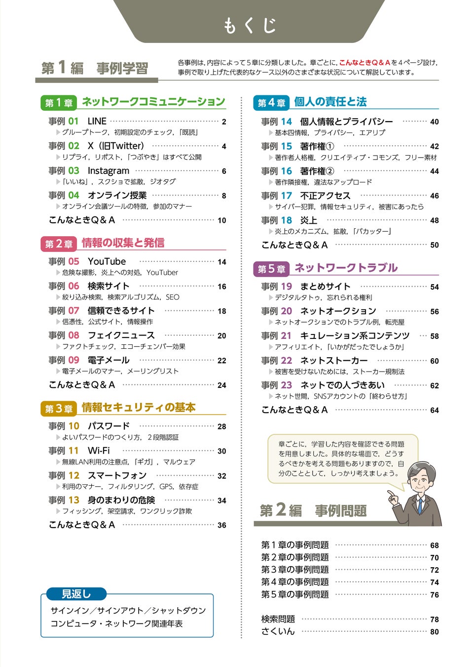 そこで、「ケーススタディ情報モラルAdvance」として全面的に更新するにあたっては、ネット上の人間関係につながることを意識して、事例をつくりなおしました(18炎上、19まとめサイト、22ネットストーカー、23ネットでの人づきあい など)。もちろん、個人情報(14個人情報とプライバシー)、著作権(15~16著作権)など、これまで重要な内容としてきた「情報モラル」の内容は、かわらず網羅しています。