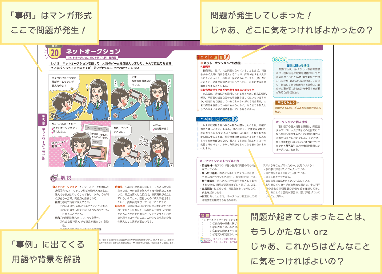 登場人物は高校生を設定しており、高校生はもちろん、どんな年代の人であっても、これらの事例を「自分の問題」として考えることができるようにしています。