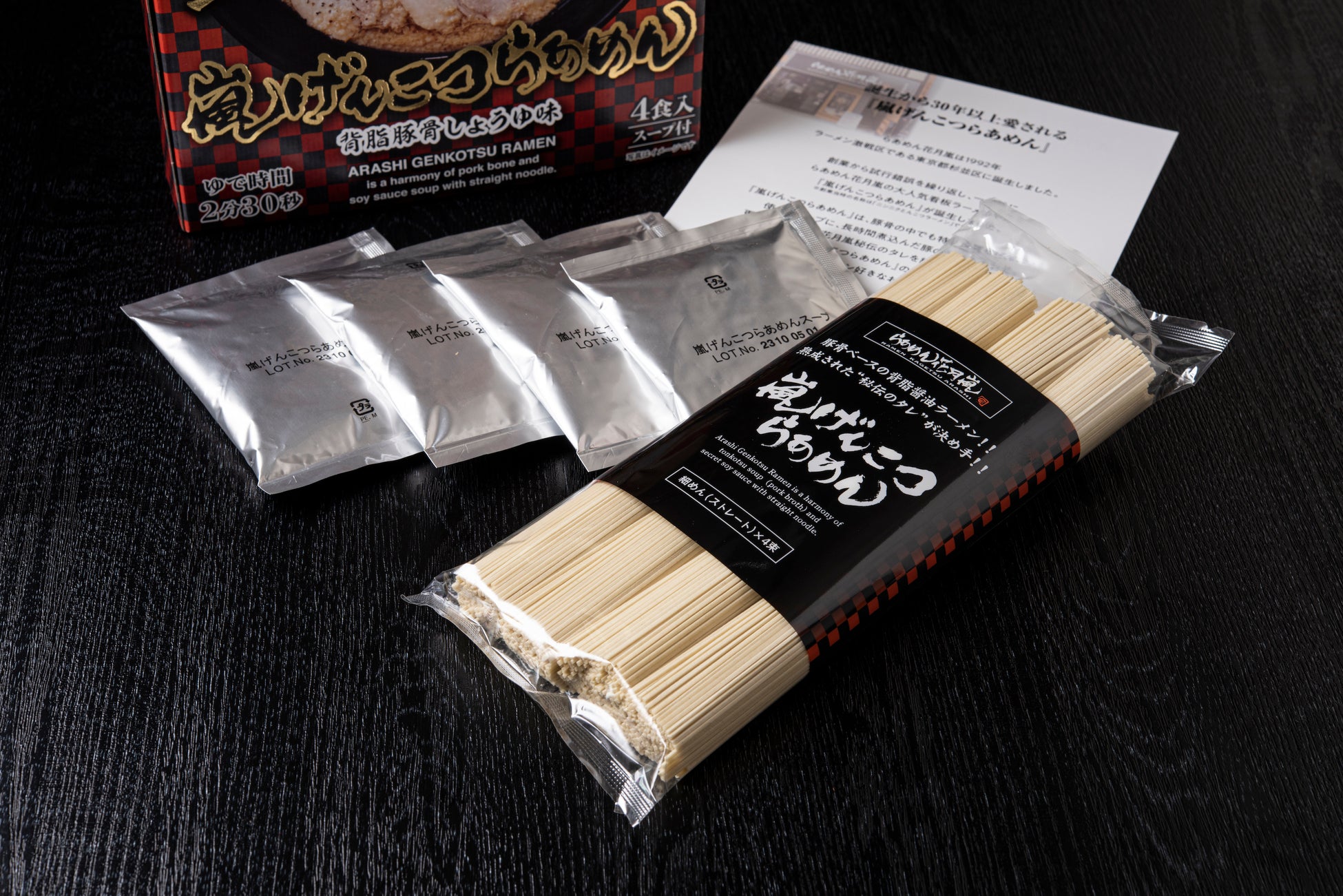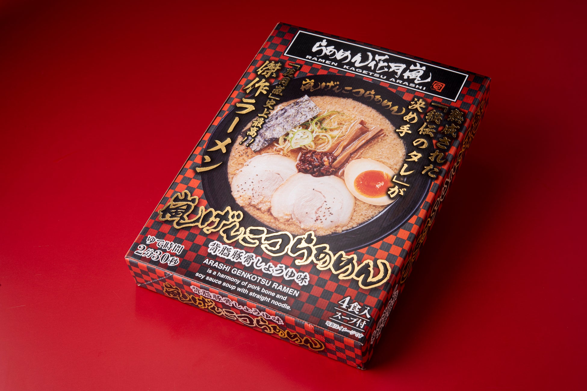 グロービート・ジャパン(株)が運営するラーメンチェーン「らあめん花月嵐」の代表商品『嵐げんこつらあめん』を、自宅でも手軽に楽しめるように、乾麺タイプにアレンジ致しました。今回これを化粧箱に詰め込んで、4食入りの商品として販売をスタートいたします。