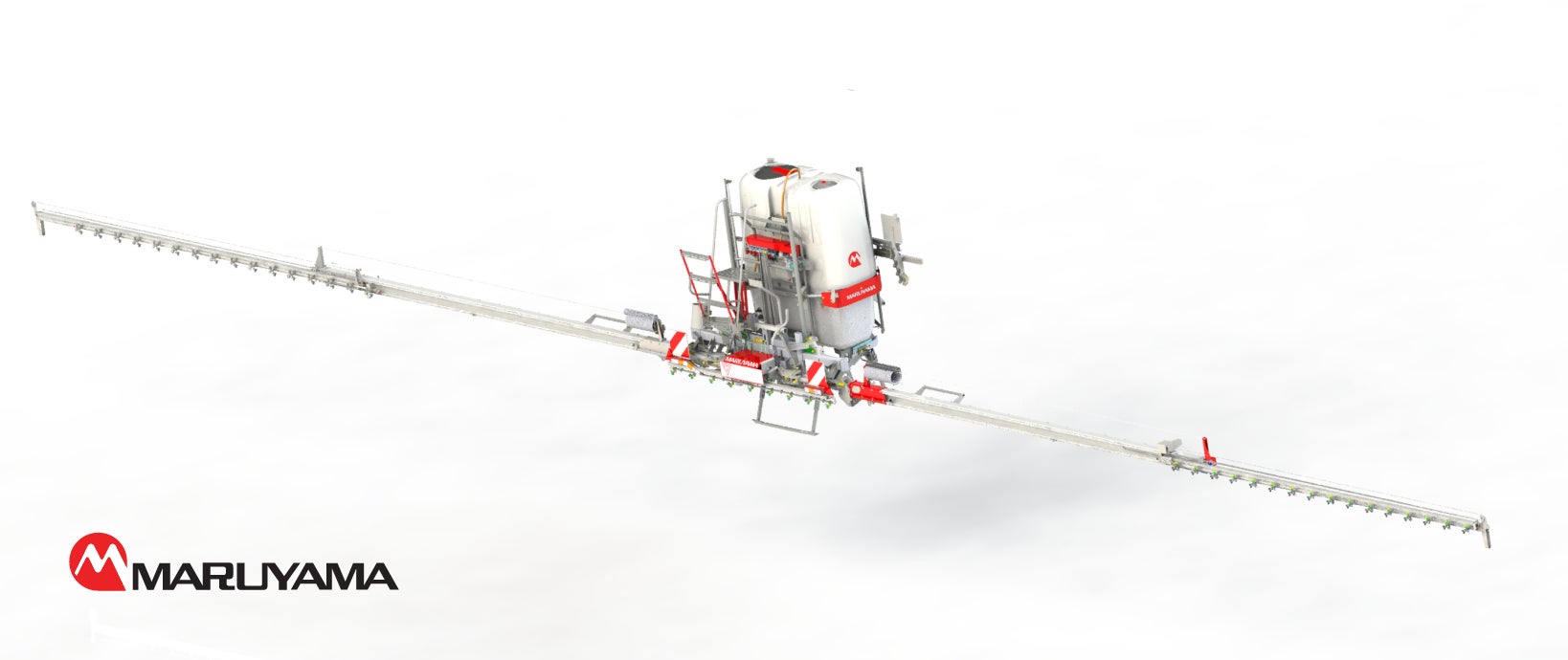 変形圃場に薬剤を散布する際に、必要な部分のみへの散布を可能にしたセクションコントロール技術です。MARUYAMAスライドコントロールシステムは外周を本機で走行しマッピングすることで、散布作業時に自動で噴霧・停止の切り替えを行います。二段目ブーム先端ノズルは1頭口ずつ噴霧停止ができ、ブームは最長状態のまま制御ができるので、振り子の原理を応用したブームの水平制御機構が活用できます。これにより安定した高速散布が可能となり、作業負担の軽減および効率化を実現します。