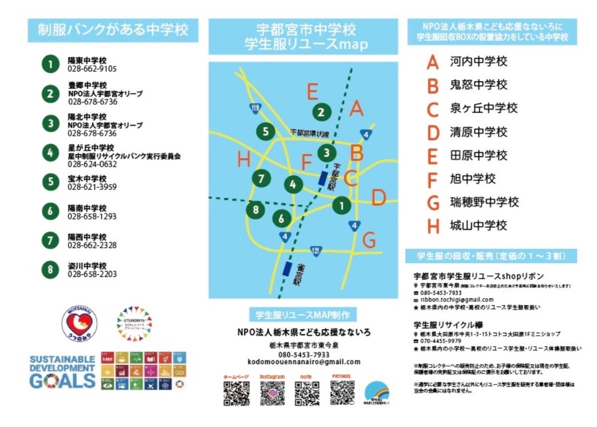 裏面 宇都宮市内中学校制服バンク&なないろ学生服回収BOX設置中学校MAP・販売店