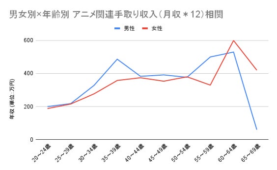 (図8:アニメ業界従事者の男女別、年代ごとの平均アニメ関連収入)