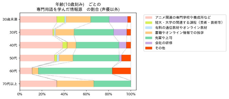 (図13:声優を除く年代別職業知識の情報源の分布)