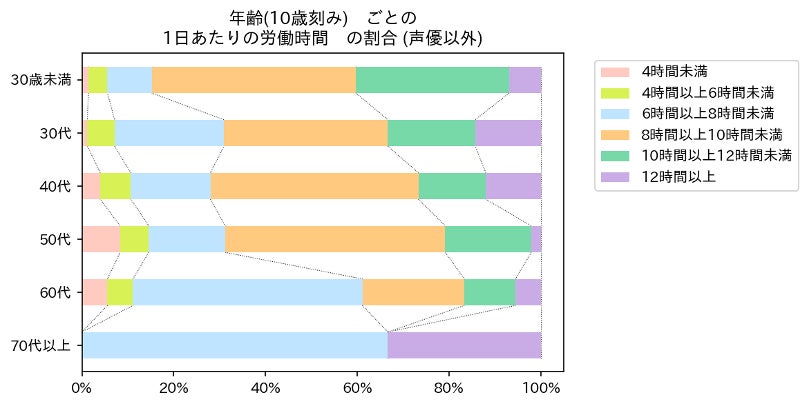 (図3:声優を除くアニメ業界従事者の年代ごと1日あたりの労働時間の分布)