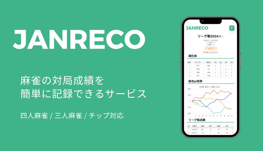 Janreco(じゃんれこ)は、四人麻雀・三人麻雀に対応し、チップ計算も含めた麻雀の対局成績を簡単に記録できるサービスです。1人がユーザー登録をするだけで、プレイヤー全員の対局成績を記録できる仕組みになっています。リンクを共有することで友人や仲間と対局成績を共有し、麻雀をより楽しむことができます。さらに、リーグ機能を活用することで、麻雀プロリーグ「Mリーグ」のように特定のルールで、リーグに参加したプレイヤーの同士の対局成績を継続的に記録し、順位表や成績推移グラフを確認することもできます。