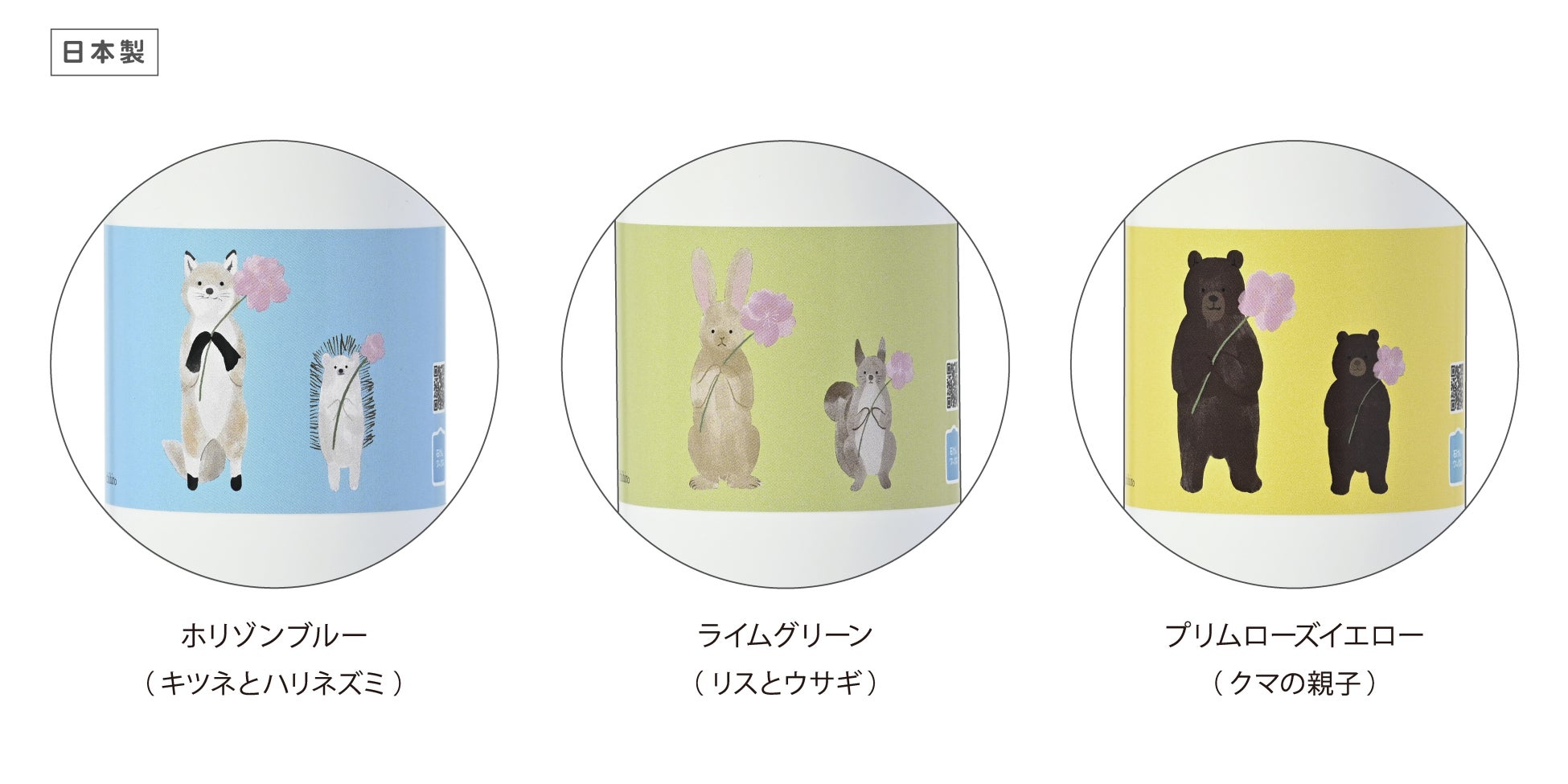 3つのカラーにそれぞれ「キツネとハリネズミ」、「リスとウサギ」、そして「クマの親子」が描かれています。手には一輪のお花。愛らしい動物たちが、キッチンや手洗い場を「優しい空間」に。