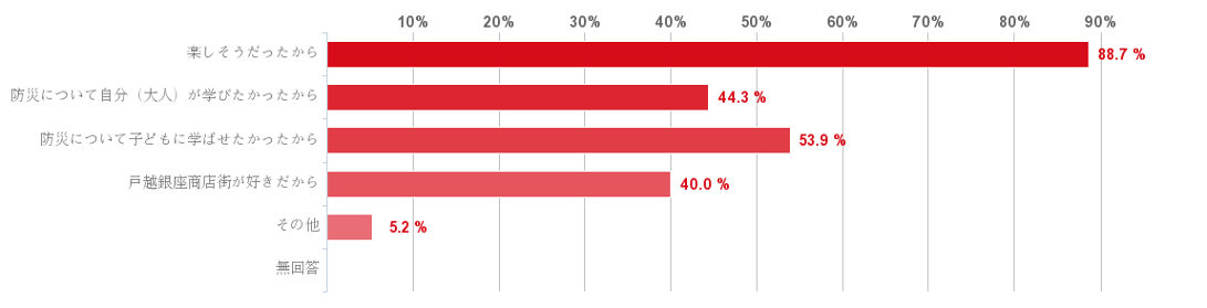 また、参加理由についても尋ねたところ、通常の防災訓練と比較すると、「楽しそうだったから」という回答が88.7%に上りました。商店街の通り沿いで実施しているため、自分の目で見て楽しそうな雰囲気を感じ取り、そのまま参加できるというアクセスのしやすさも相まってこの回答が多くなったことが推察されます。