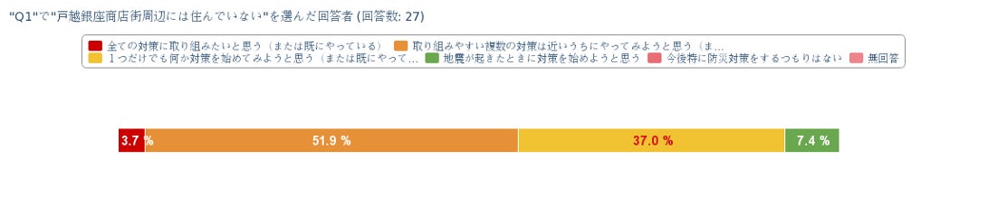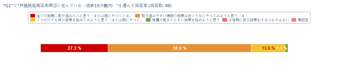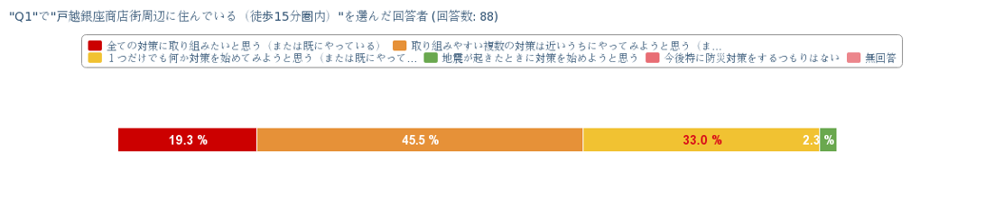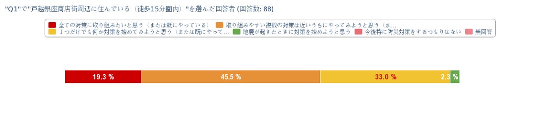 戸越銀座商店街では継続的に防災の取り組みを行なってきた影響で、戸越銀座商店街にお住まいの参加者(①)の防災に対する意識や取り組み状況は、他のエリアの参加者(②)に比べると、参加前から防災に対する意識や取り組み状況がそもそも高い(上位2位までの回答率:①64.8%、②55.6%)傾向にあっただけでなく、参加後はそれがさらに高まるという結果が得られました(上位2位までの回答率:①85.3%(+20.5%)、②74.1%(+18.5%))。