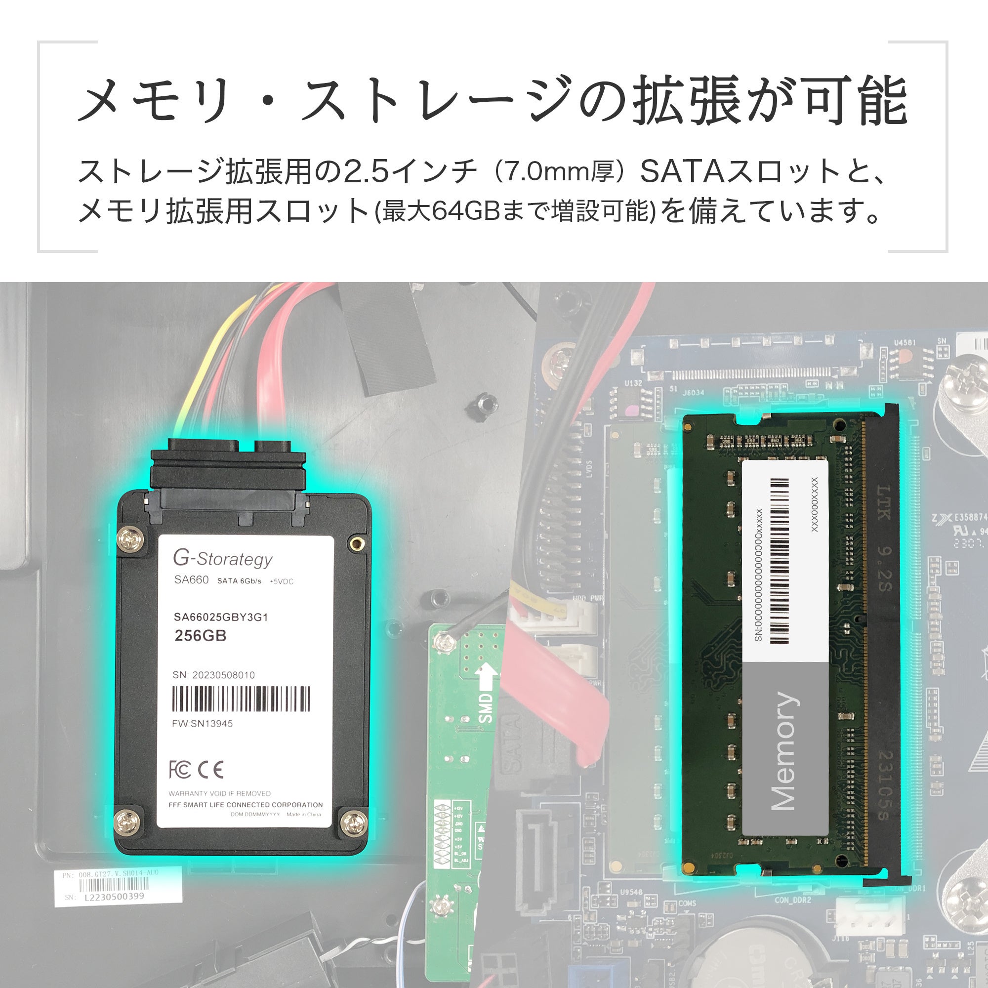 メモリーは拡張用の1スロットを備え、1枚最大64GBまで増設が可能。ストレージも拡張用の2.5インチ(7.0mm厚)SATA3.0の空きスロットで拡張が可能です。