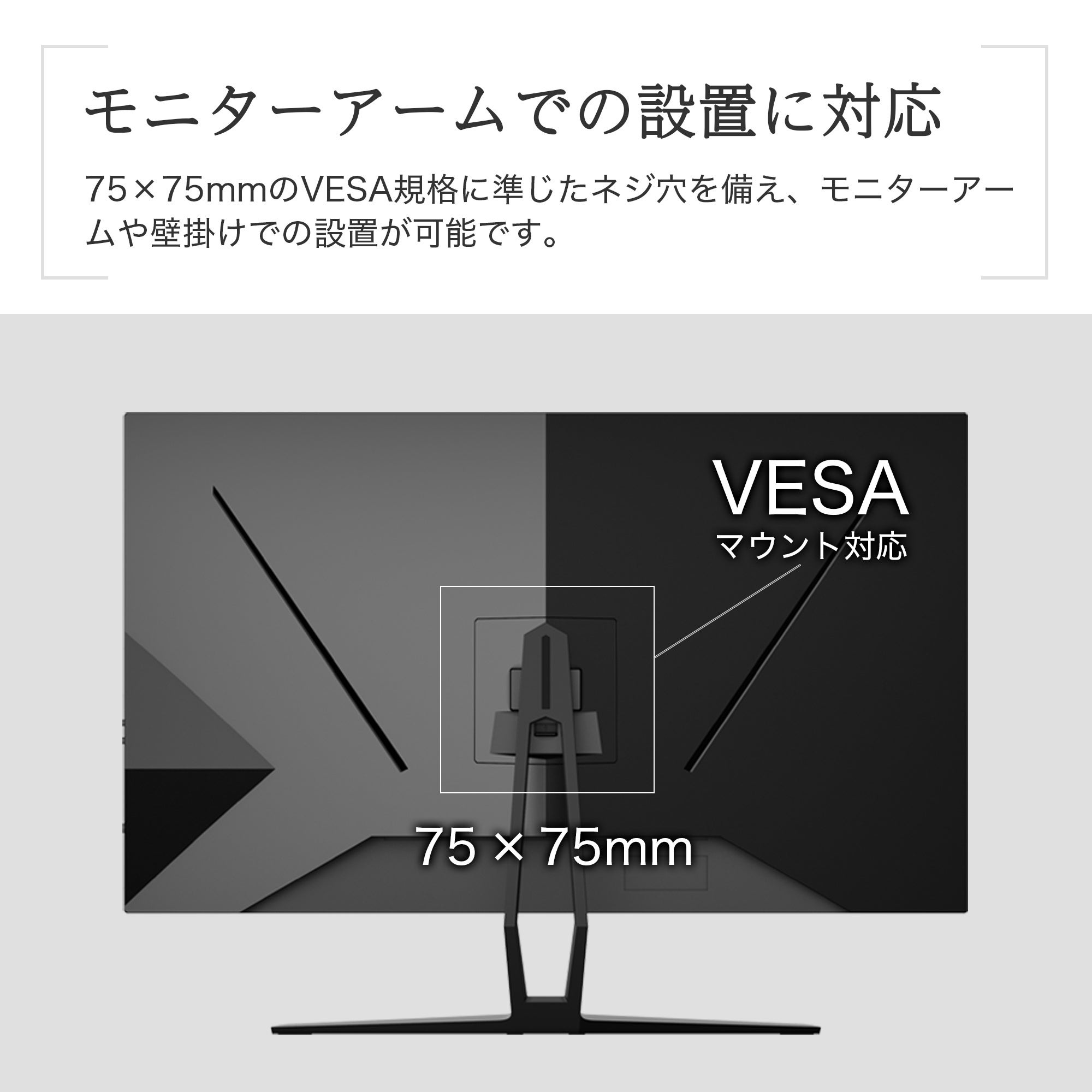 背面に75×75mmのVESA規格に準じたネジ穴を備え、モニターアームや壁掛け設置にも対応しています。