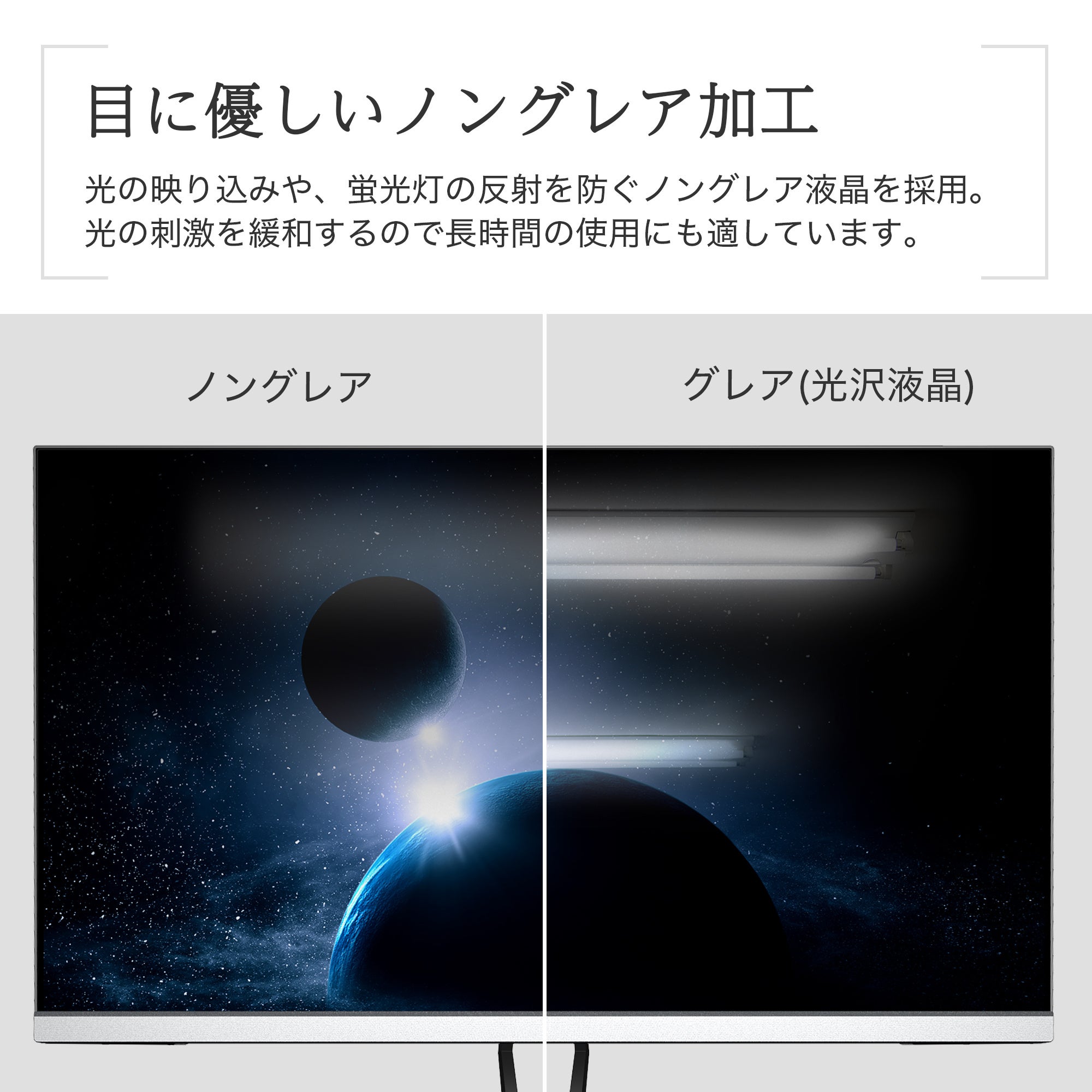 ノングレア液晶は外光の映り込みや、蛍光灯などの光が反射するのを防ぎます。光の刺激を分散、緩和させるので長時間の使用に適しています。