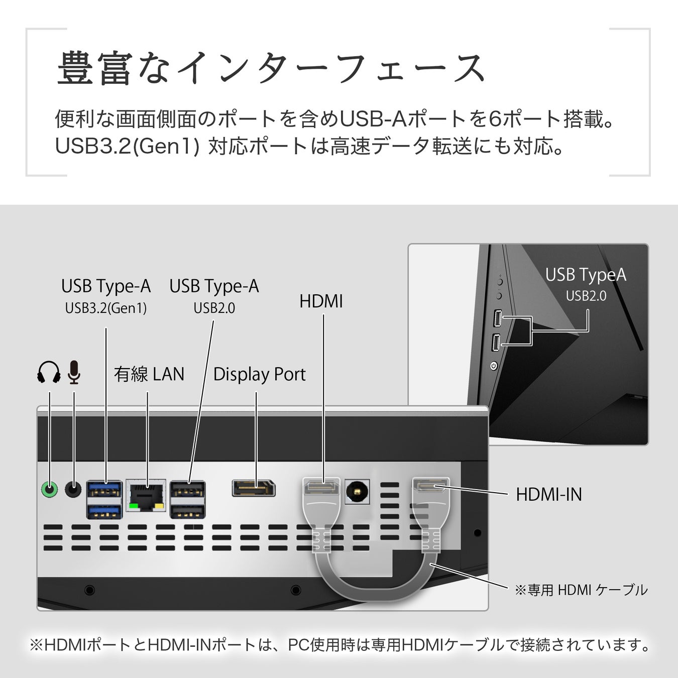 さらに、合計6ポートのUSB Type-AポートやBluetooth5.1を搭載し、周辺機器との接続も手軽です。DP接続によるデュアルモニター対応や、ゲーム機、ノートPCからのHDMI入力によるサブモニターとしての機能など、多才な面を併せ持つ優秀なデバイスとなっております。