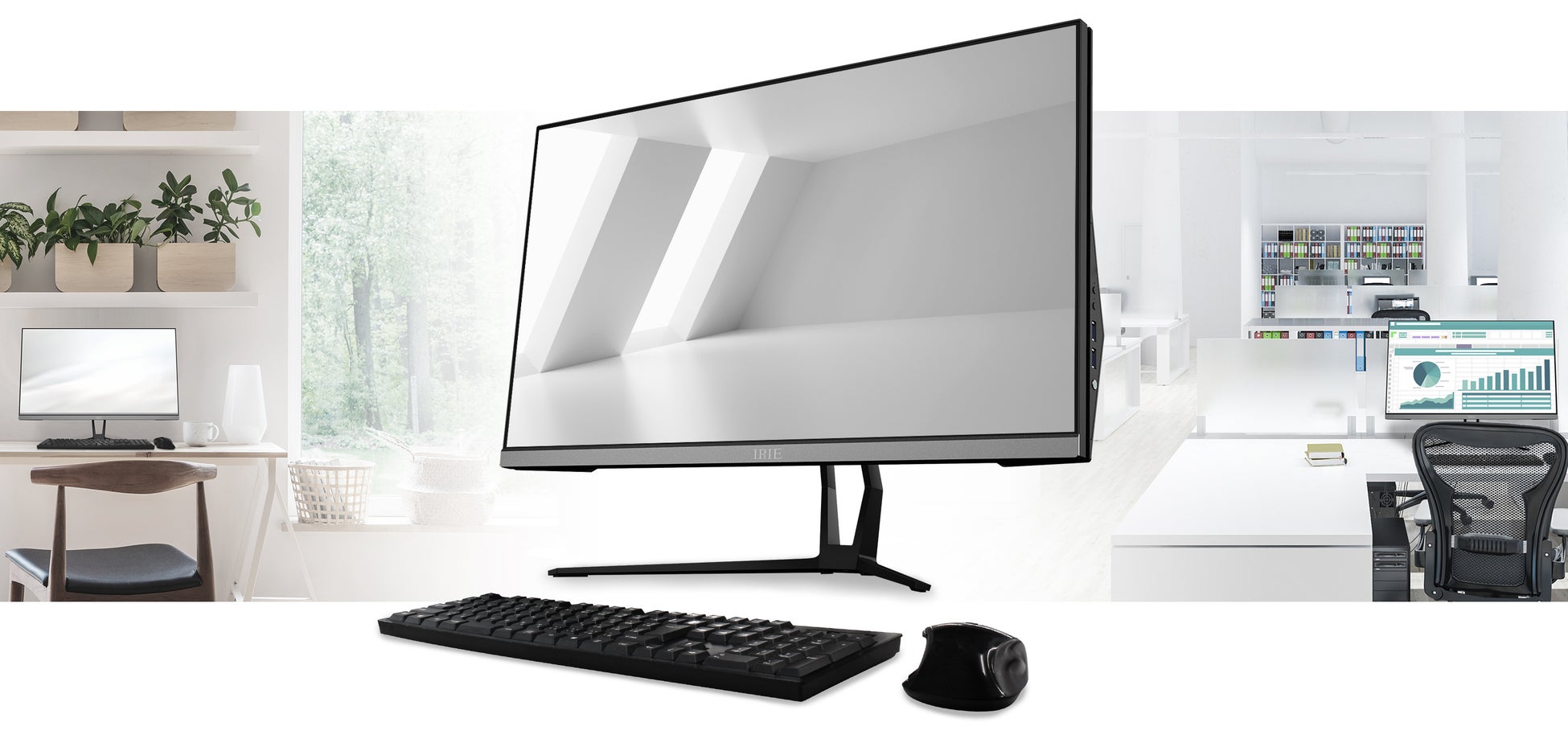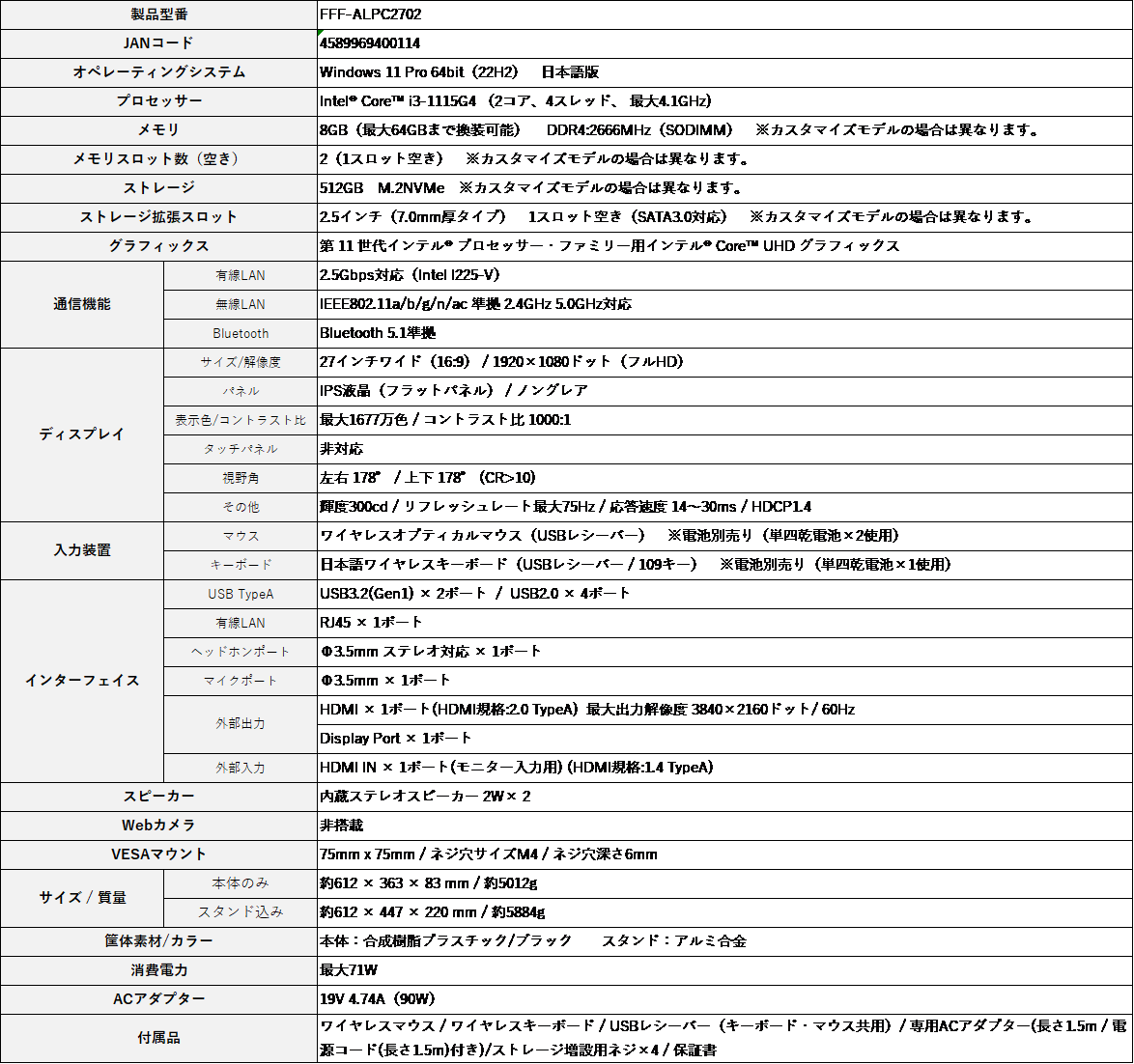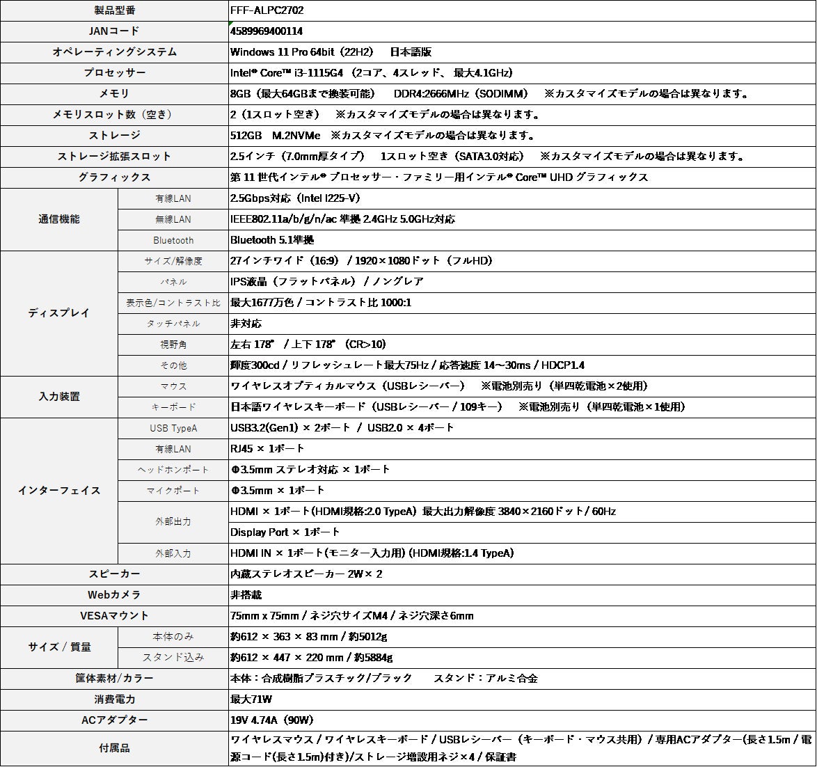 FFF-ALPC2702は、パソコンとモニターを一体にした省スペースなオールインワンPCです。Intel® Core™ i3プロセッサーと8GBのメモリーを備え、メインストレージはM.2 NVMe対応SSDなのでアプリケーションの起動など、オフィスでも自宅のリビングでも快適に動作します。