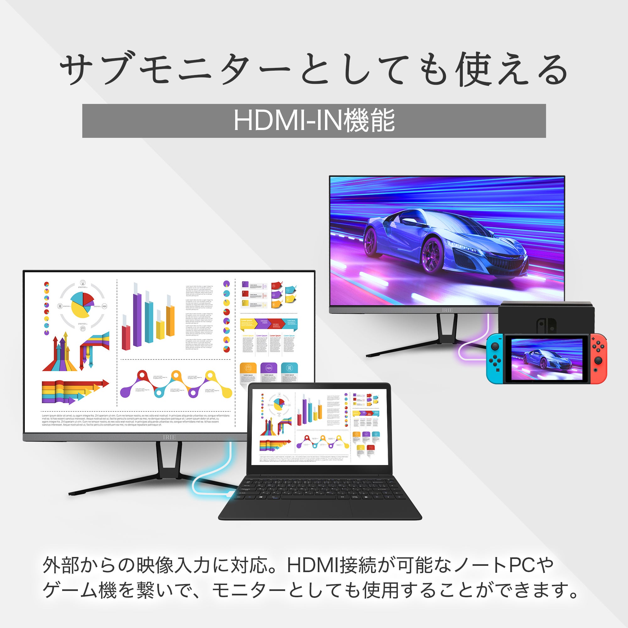 HDMI-INポート搭載で外部からの映像入力に対応。HDMI接続が可能なノートPCやゲーム機を繋いで、一般的なモニターとしても使用することができます。