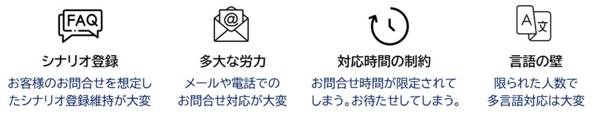 インバウンド需要が高まる中、世界中から寄せられるお問合せの対応は、ホテルの魅力をお伝えするうえで重要性を増しています。その一方、ホテル・旅行業界は人手不足で、異なる時間帯や多言語に対応できる選任担当者を十分に置けていません。また従来型のチャットボットをご利用されているホテルの従業員は、お客様のお問合せを想定したシナリオの登録と維持に、多くの労力を費やしています。更にお問合せデータを分析することが困難なため、サービス改善を判断することが課題でした。
