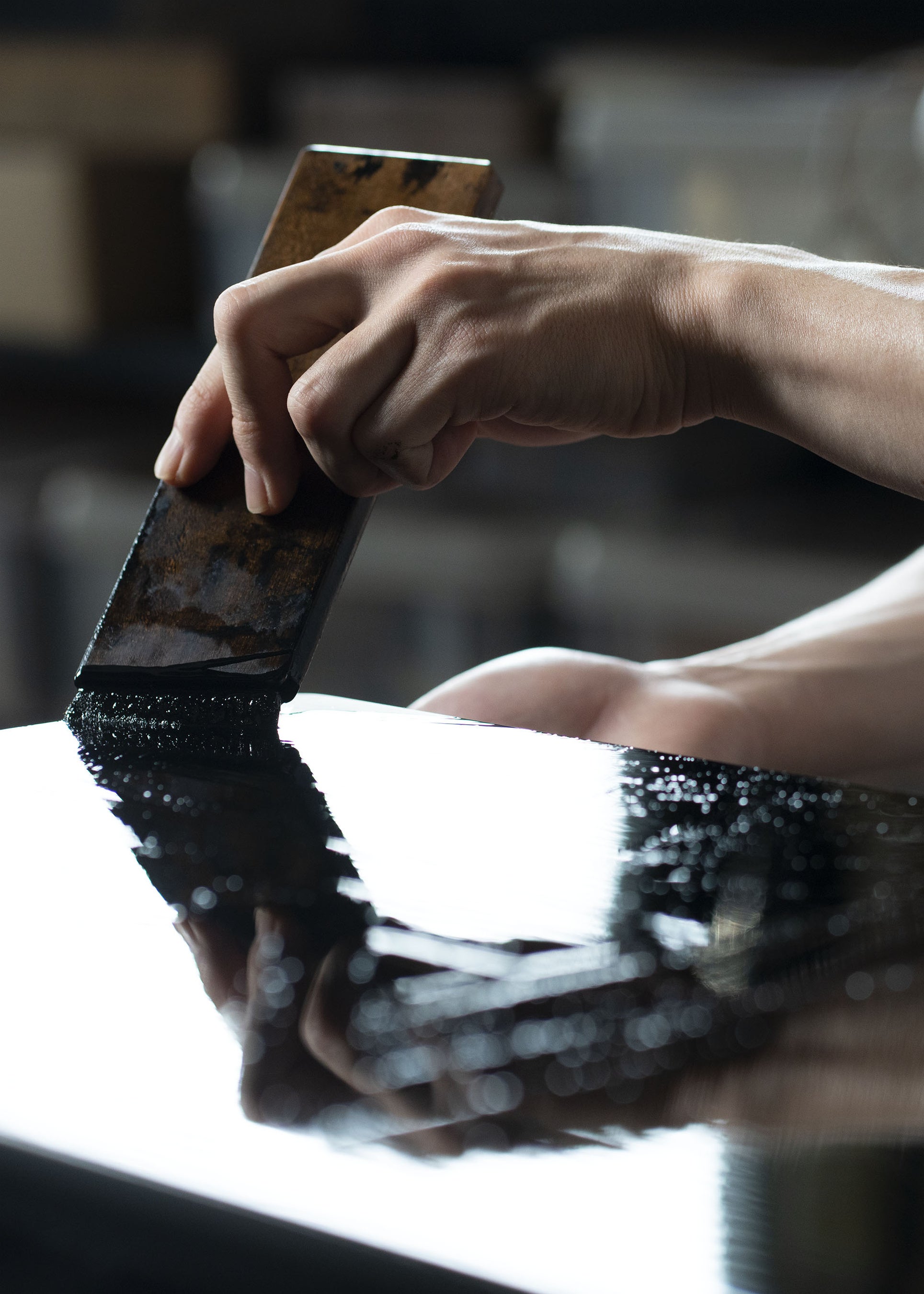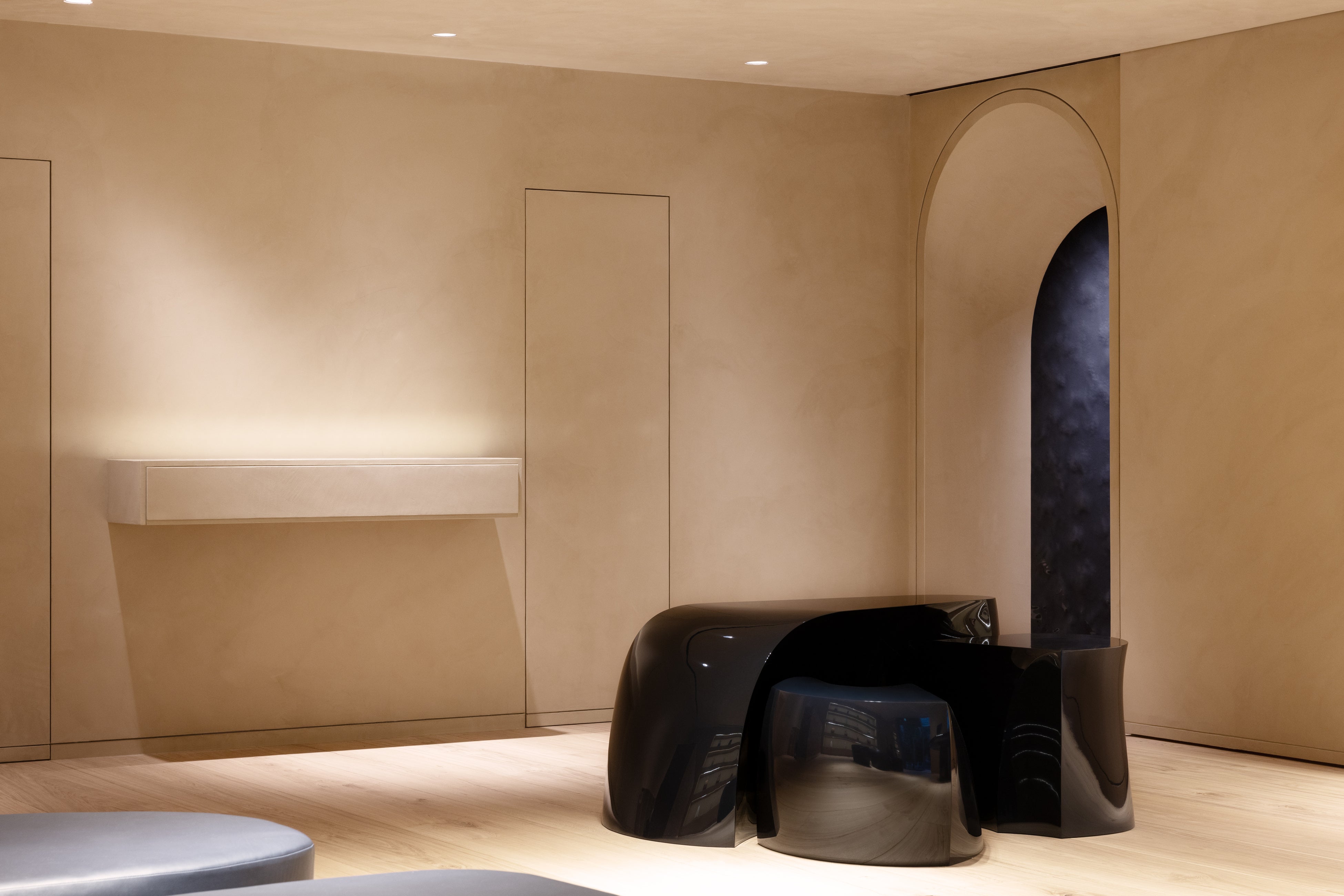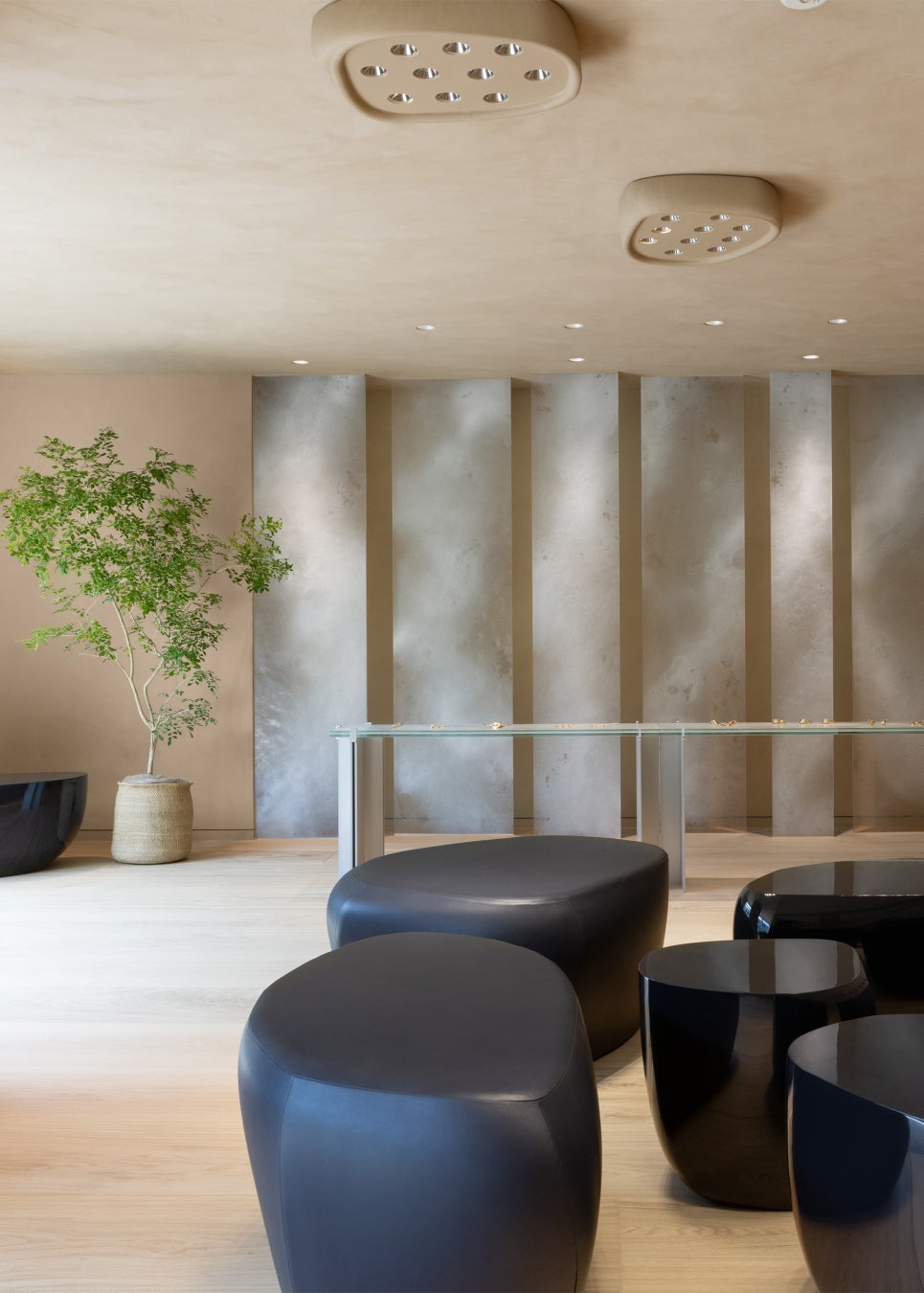 空間に配置された革製のスツールと並ぶ、漆塗の台座。様々な自由のフォルムを持つ、光沢感が美しいこの作品は1929年に創業の京都を代表する「塗師(ぬし)」の職人集団、「牧野漆工芸」によって手掛けられています。他の都市の二店舗にはない、東京店のためだけに作成した、天然漆と伝統的な技術の結晶となる特別な作品。メゾンがこだわりを持つ手作りの職人技を、日本という新たな舞台でも探求することで生み出されました。