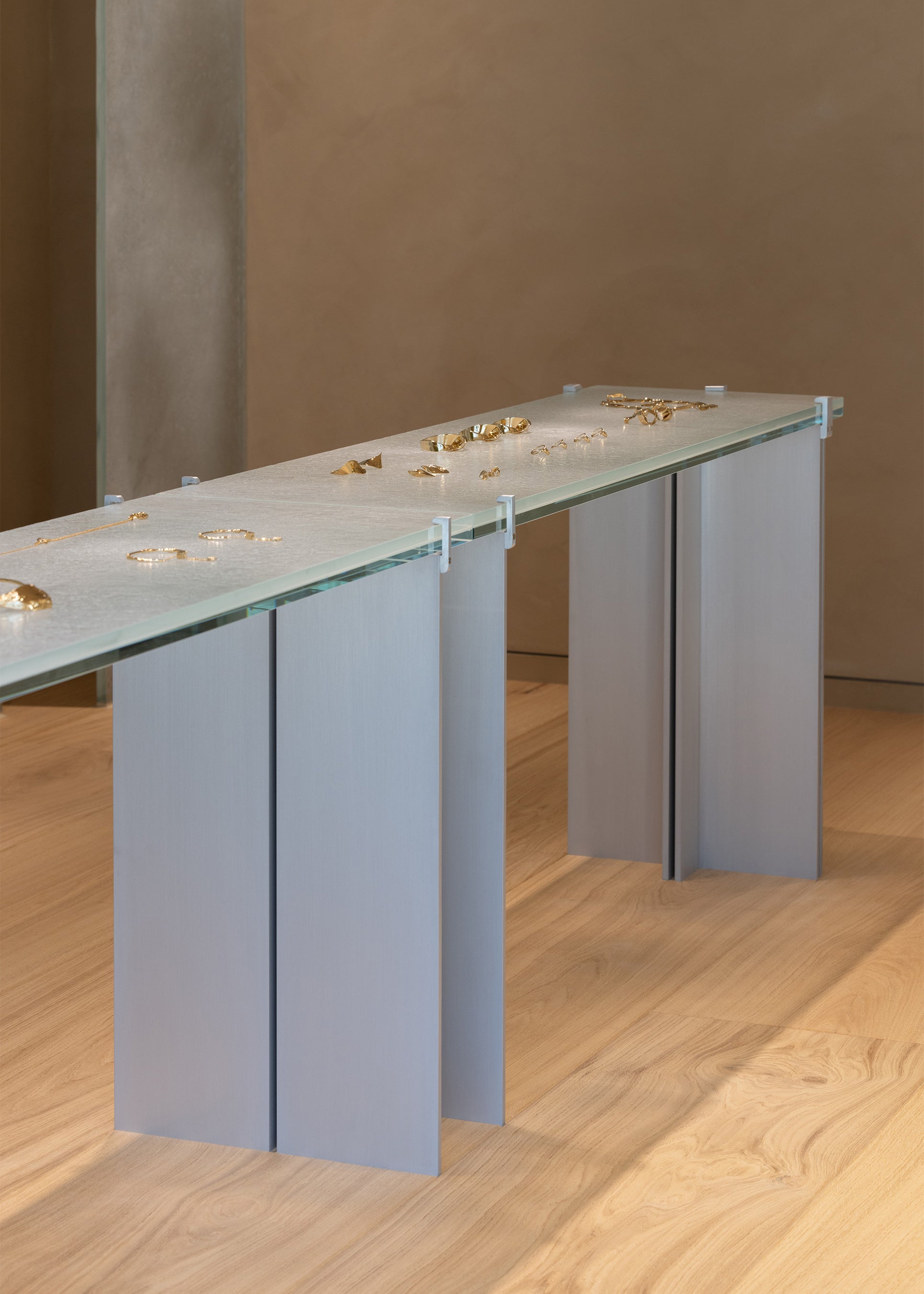 明るい光が大きなガラス窓から差し込みむ二階は、ジュエリーコレクションスペースとなっています。壁にはエマニュエル・バロワによる特注のインスタレーション作品が飾られ、アーティストの透明性と光の戯れへのこだわりを感じられます。
