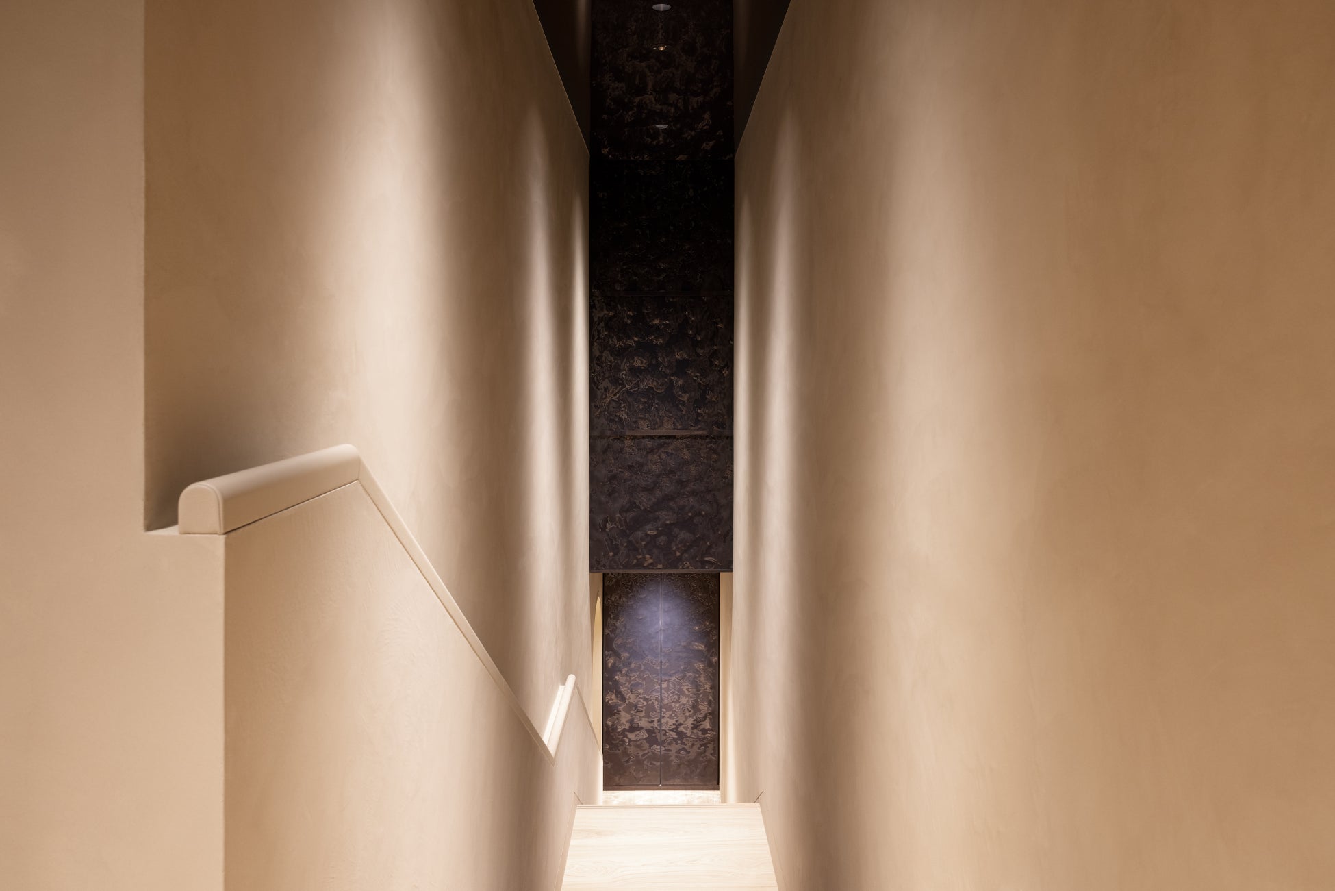 「海の層」を作り出す、ミッドナイトブルーのガラスパネル。水の流れを象徴するこの唯一無二な芸術作品は、階段の高さ全体を飾り、穏やかで、瞑想的で、優しさに満ちたひと時を提供するとともに、漆塗りの天井が店舗内の広がり感をさらに強調しています。