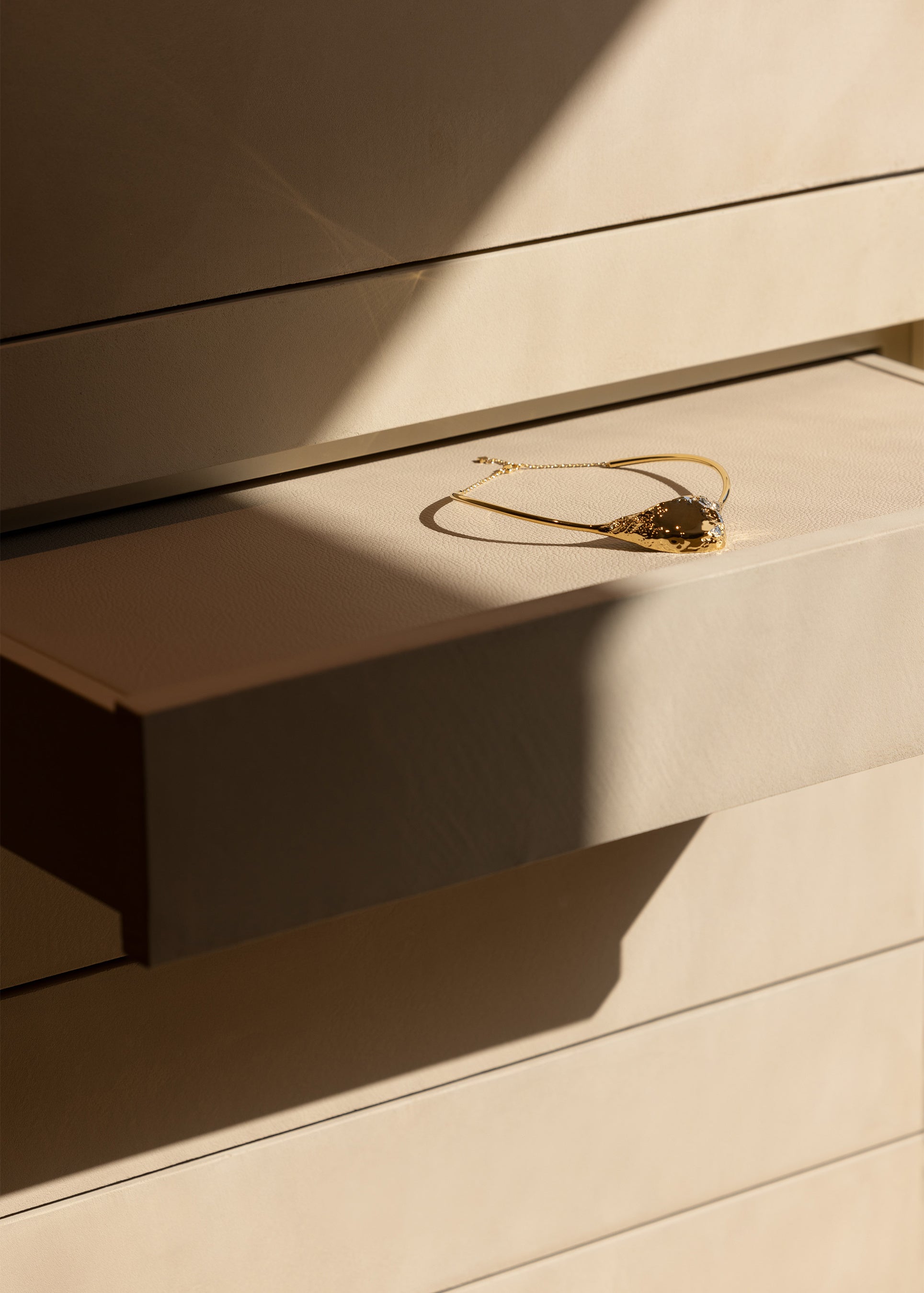 カラーバリエーション豊かなレザーグッズコレクションはもちろん、6月に発売となったジュエリーコレクションも取り扱い。今まで公式オンラインストアのみの販売経路であったため、旗艦店オープンにあたりアジアで唯一実際にアイテムを手に取って楽しめる場所となります。