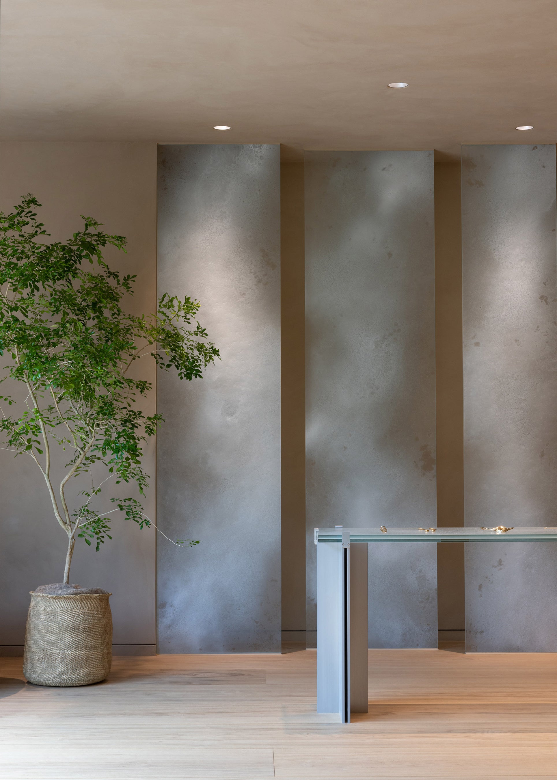 ミネラルカラーの外壁が洗練された雰囲気をもたらすとともに、高さのあるガラス張りのファサードが開放的な外観。床に使われた天然のナラ材が空間に奥行と軽さを与える一方、天井には革製の照明を複数配置。ポレーヌらしいカラートーンの砂漆喰(すなしっくい)で均一に仕上げられた壁が、店内に配置された深い藍色の什器とのコントラストを際立たせます。