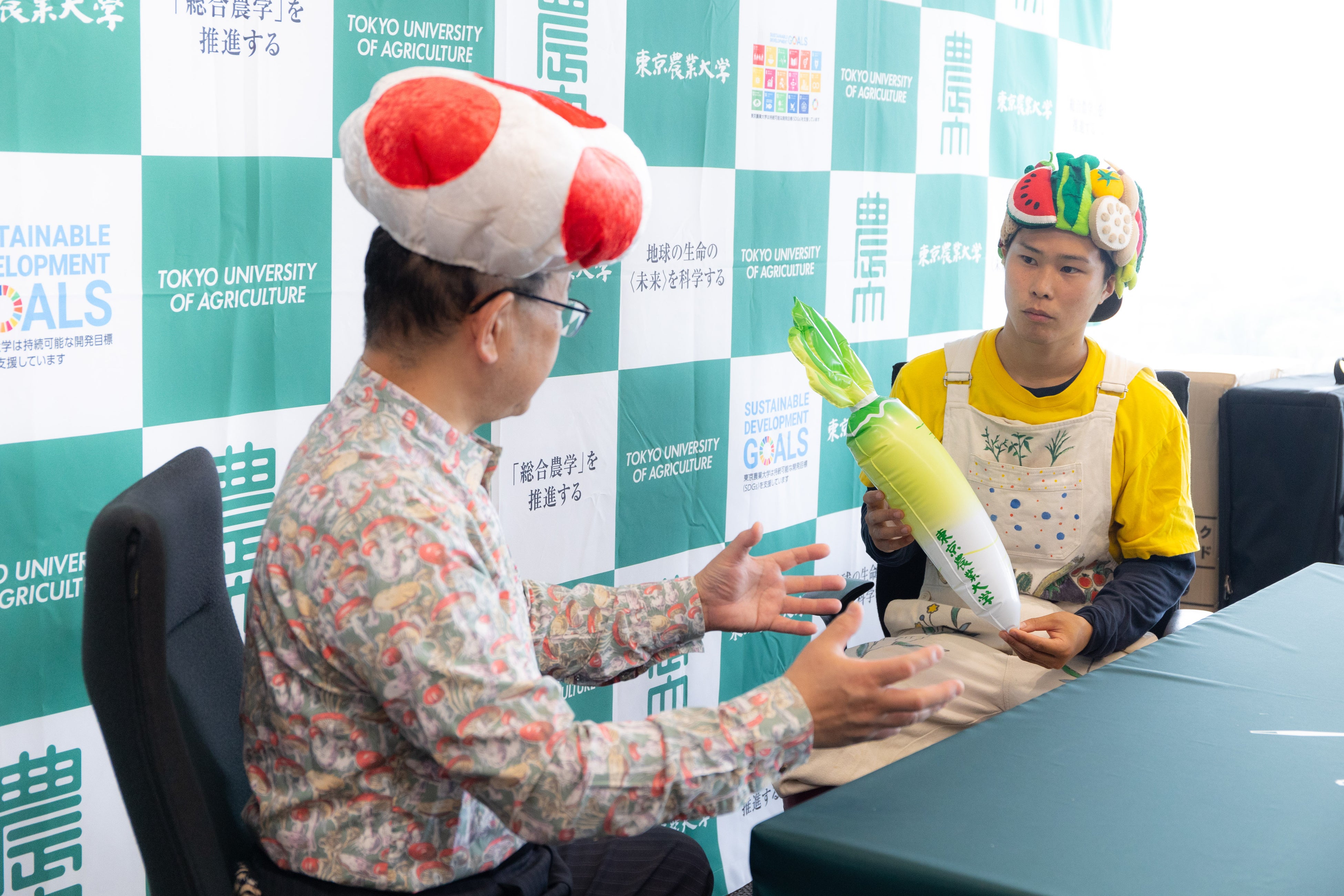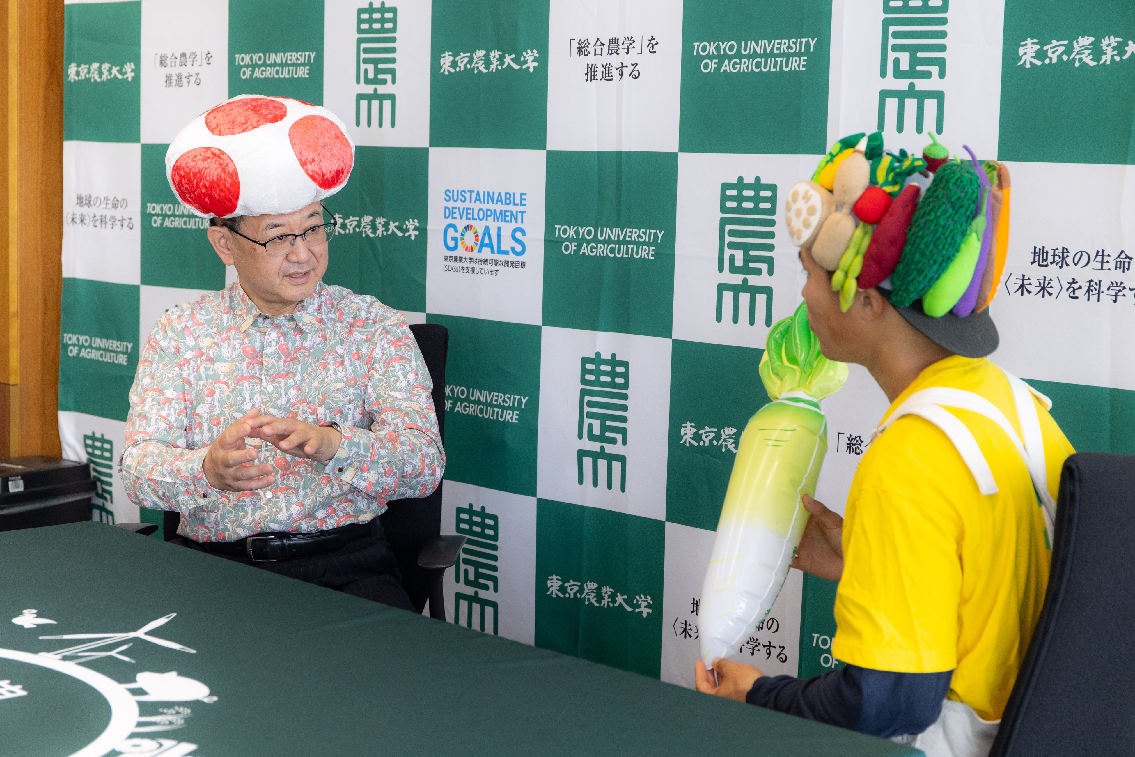 「農業と言えば、東京農業大学と言ってもらえるようにしたい」というヤサイちゃんが活動内容をお伝えすると「野菜が嫌いな子供たちに野菜の重要性について是非広めていってほしい」とエールをもらい始まった表敬訪問。農大で学べる農学は山の上から海までのすべてを科学する幅広い学問である「総合農学」の話から、農学を志望する志願者は学生全体の3%であるためもっと広げていきたいという考えをお伺いしました。