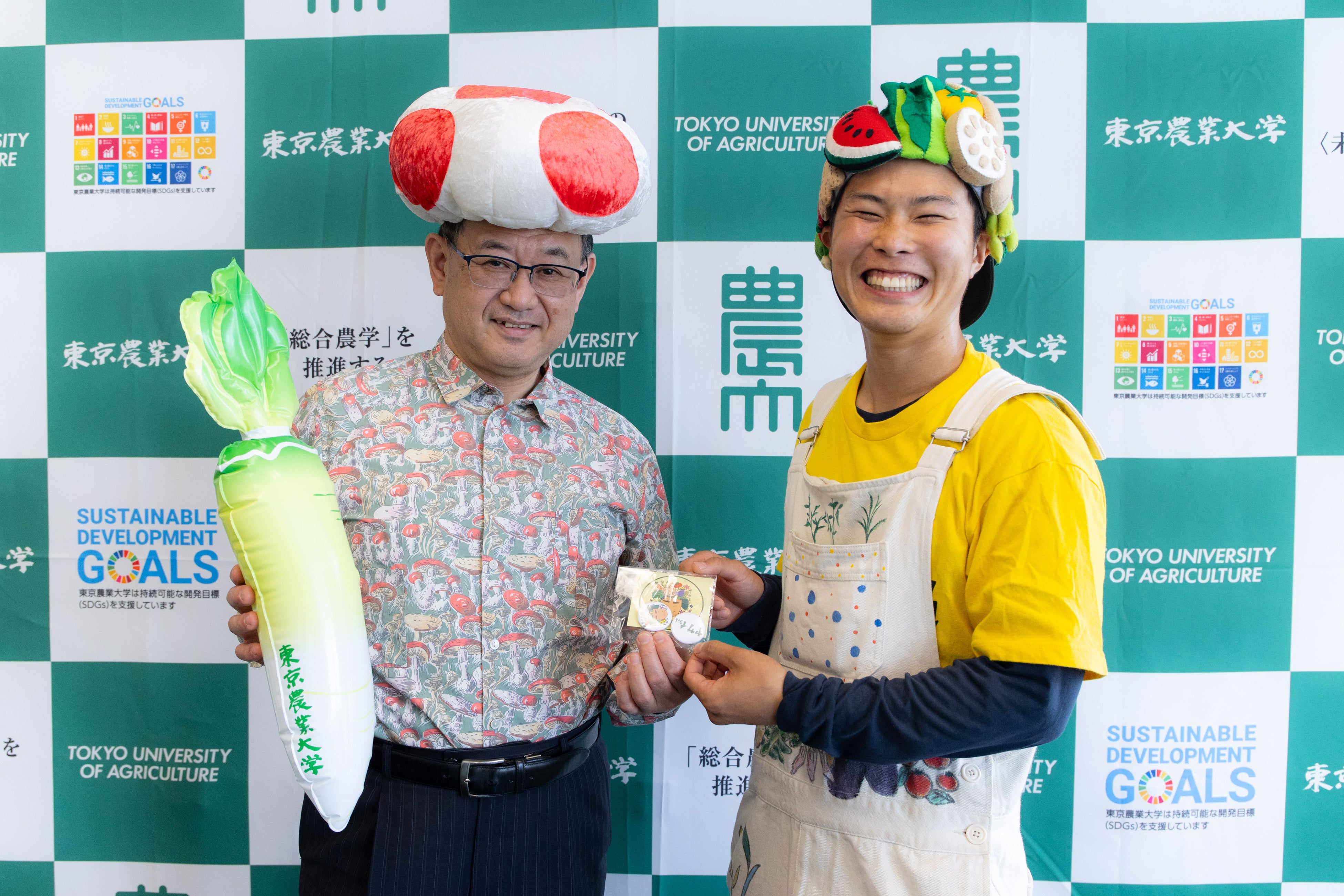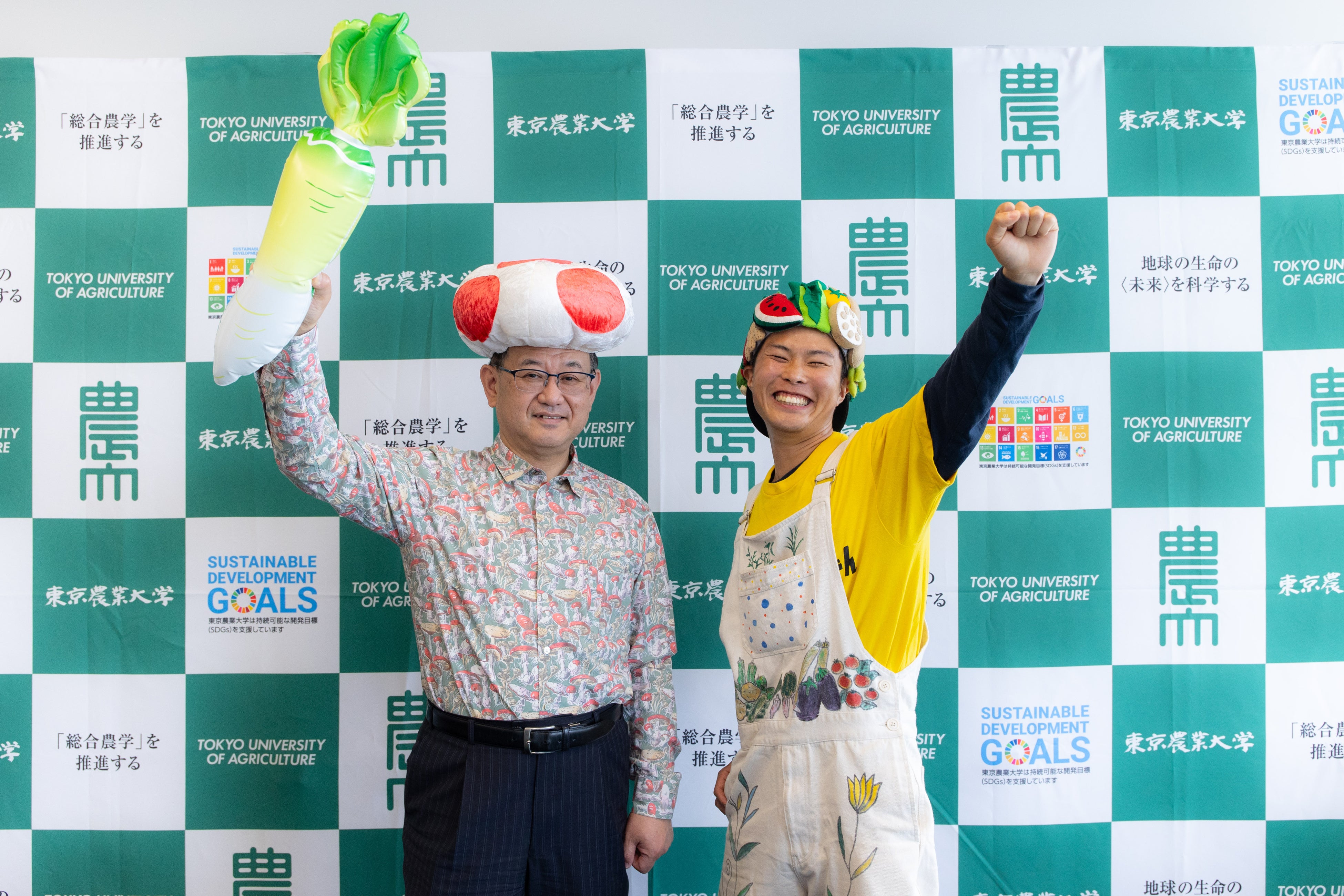 今回、ヤサイちゃんの母校である東京農業大学の江口 文陽 学長を表敬訪問し、現在の活動状況を報告いたしました。その後、食料自給率向上や有機農業の是非など、現在農学を取り巻く課題についてお話を伺いました。