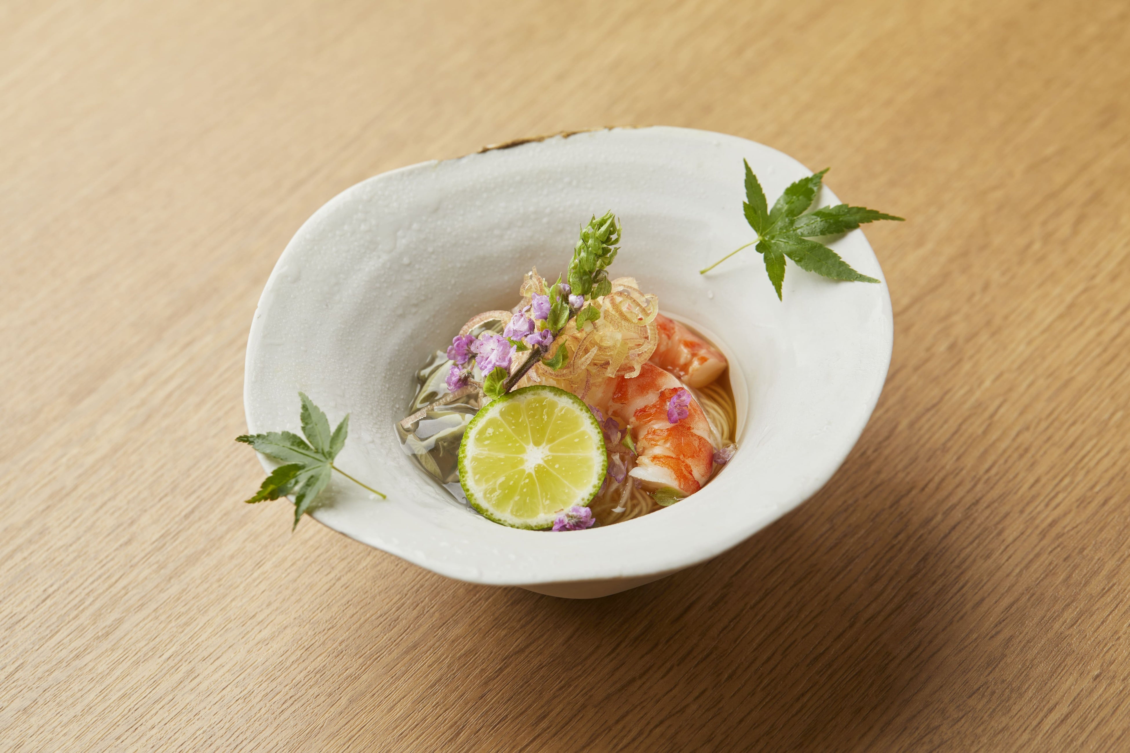 旬を楽しむおまかせコース8品9,000円(お椀・造り・揚物・八寸・焼物・飯物・水菓子)をはじめ、13,000円、18,000円のコースの先付として「葛入りそうめん」を提供(7月末までの予定)
