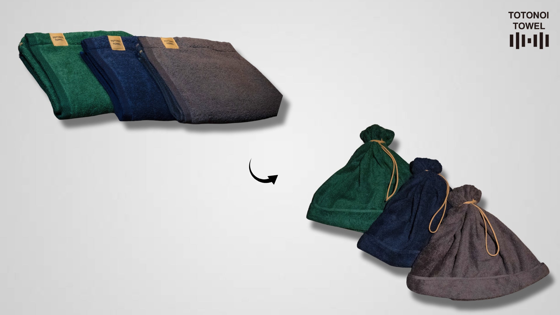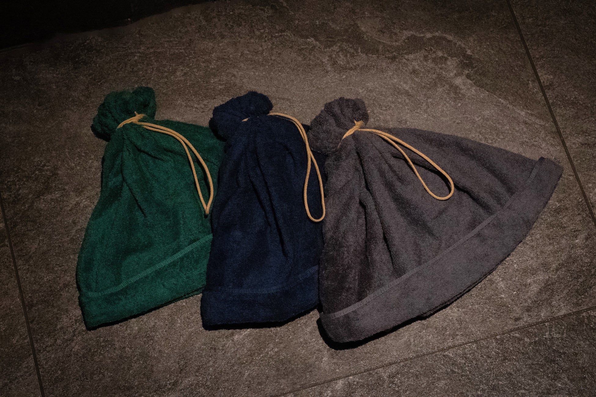 トトノイタオルは、浴室ではタオルとして利用し、サウナ室では紐を引っ張り、巻くだけでサウナハットに変身する"2WAY" 1枚2役を実現したタオルです。