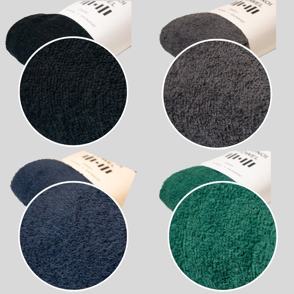 また、高密度な織り上げにより、サウナ内の熱を感じにくく、洗濯を繰り返してもへたりにくいのも特徴です。 留め具には紐とマグネットを採用することで、凹凸を感じにくく、タオルとしても快適にご使用いただけます。