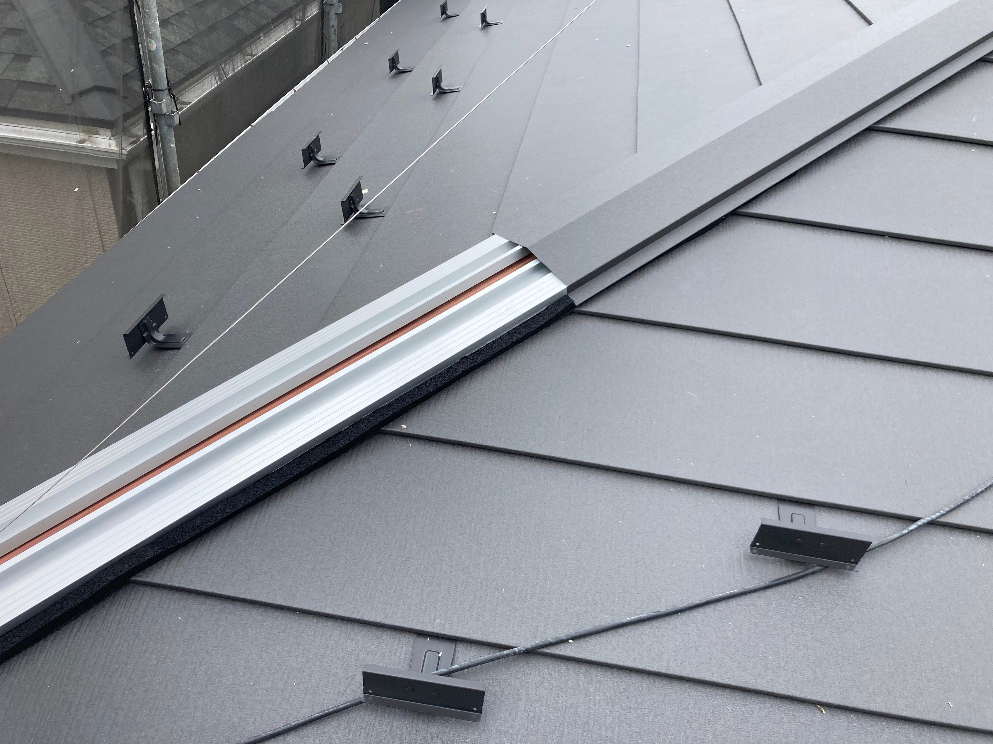 横葺き金属屋根の棟をエスヌキ工法で仕上げた建物で実施する検証試験です。