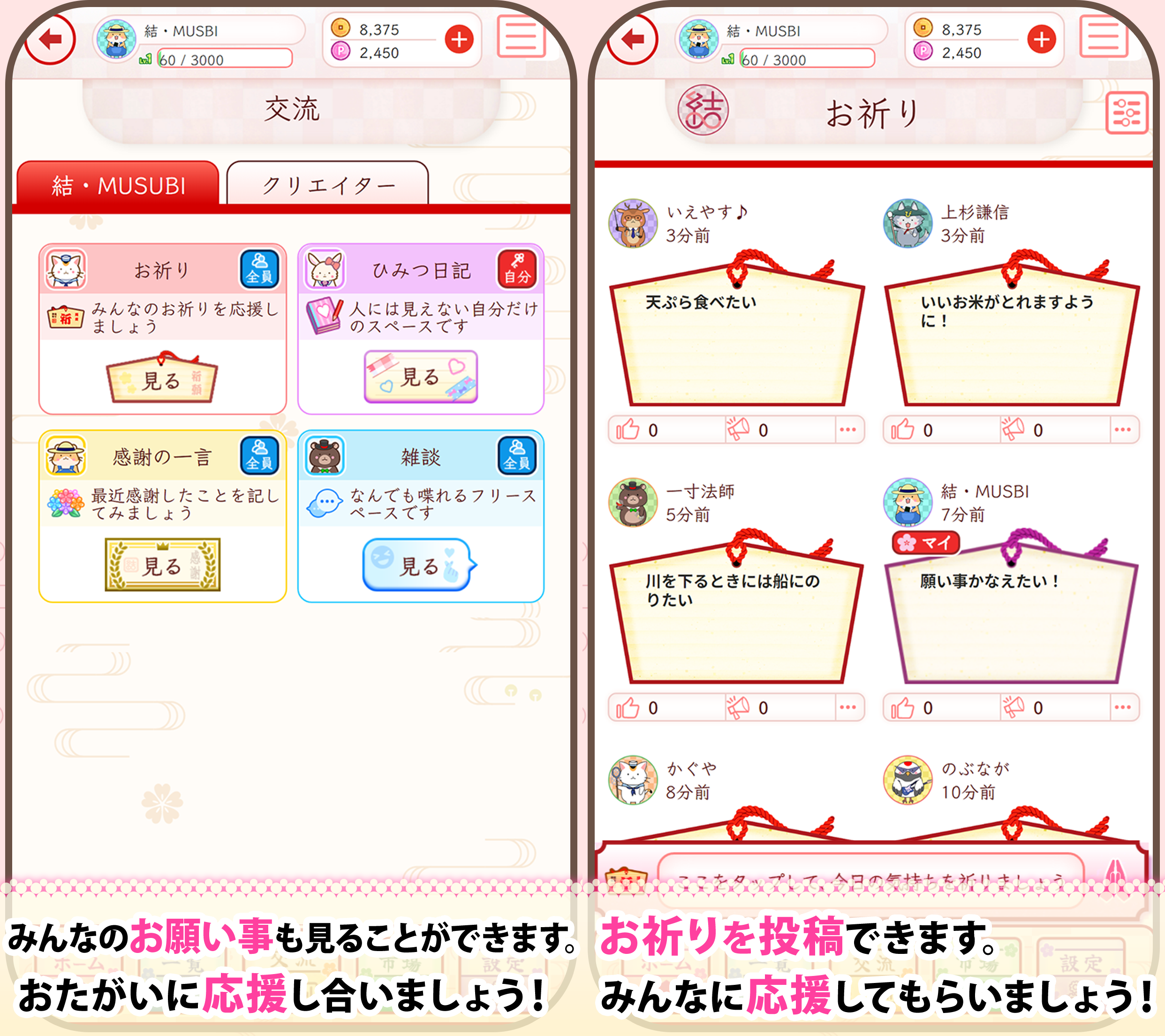 他の参拝者のお祈り事を応援したりメッセージを通じて交流することができます。もしかしたら気の合う仲間と巡り会えるかもしれません。