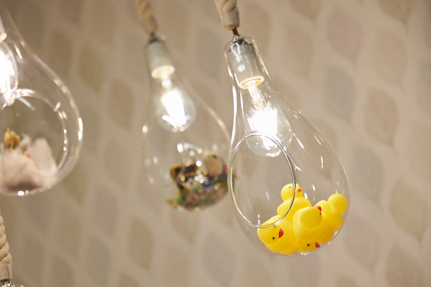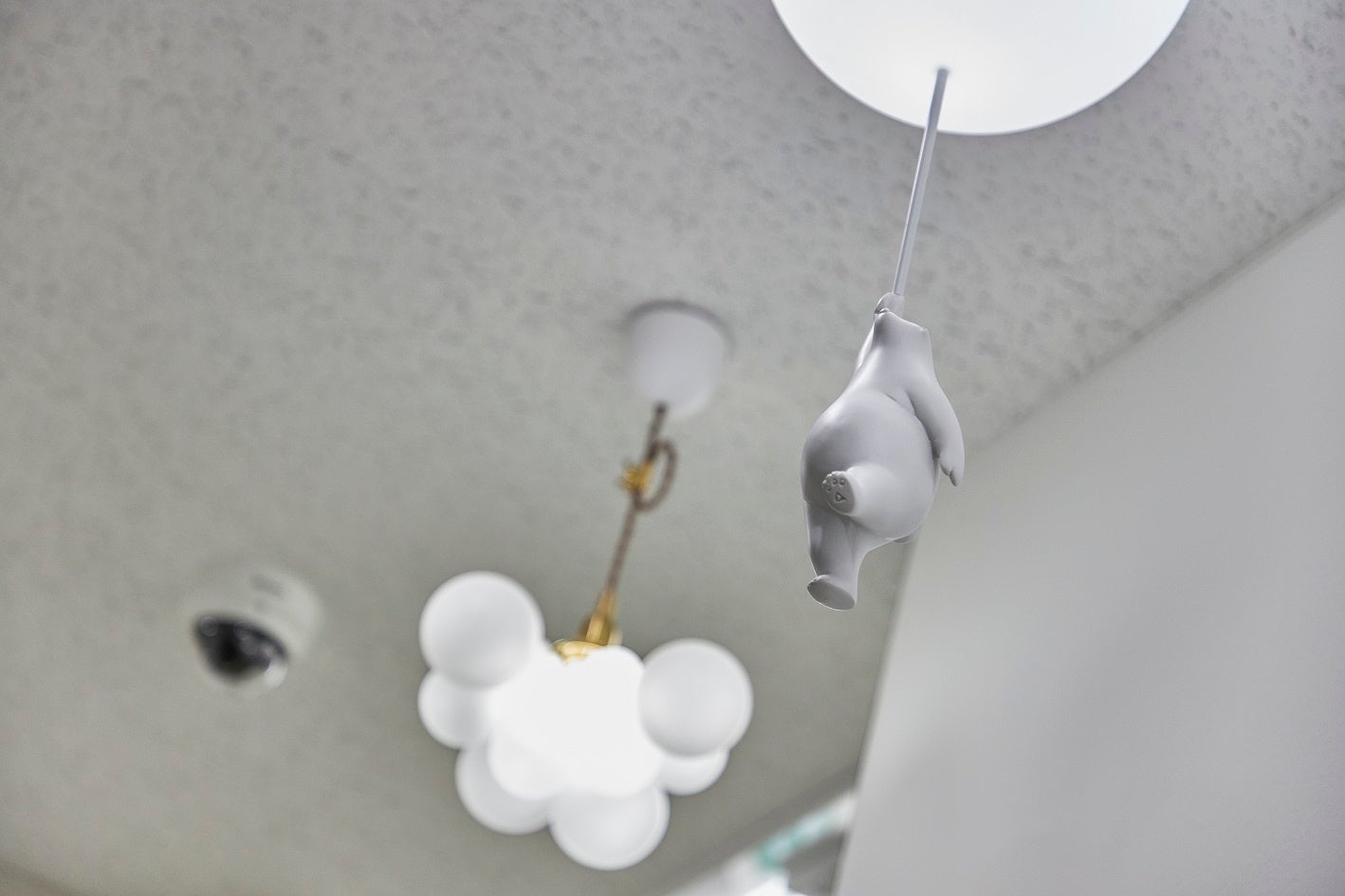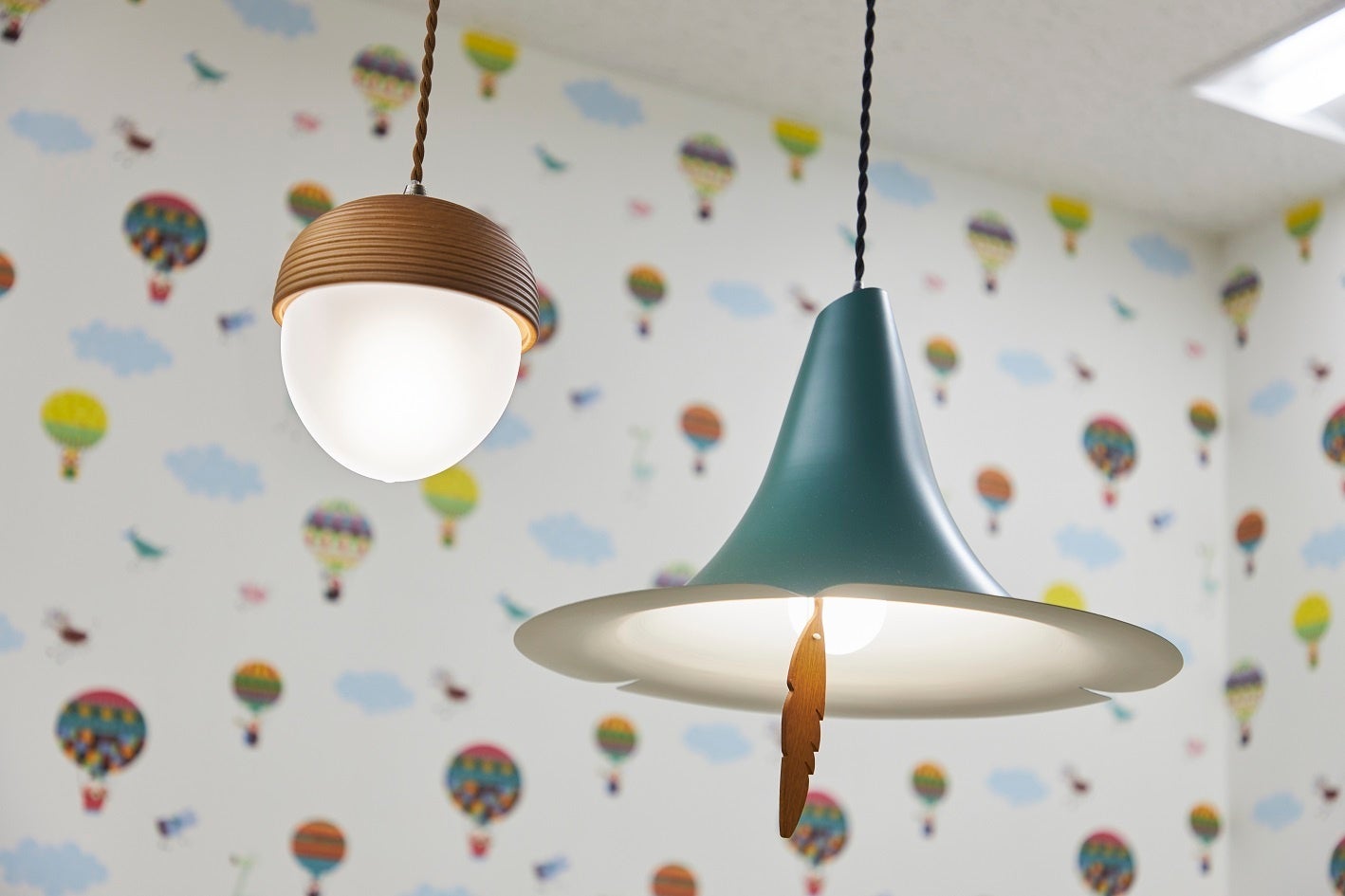 風船で空を飛ぶくま、帽子やどんぐりをモチーフにした照明、気球に乗って動物と旅する壁紙など、おとぎ話の絵本の中で過ごすような空想の世界を、ぜひお楽しみください。