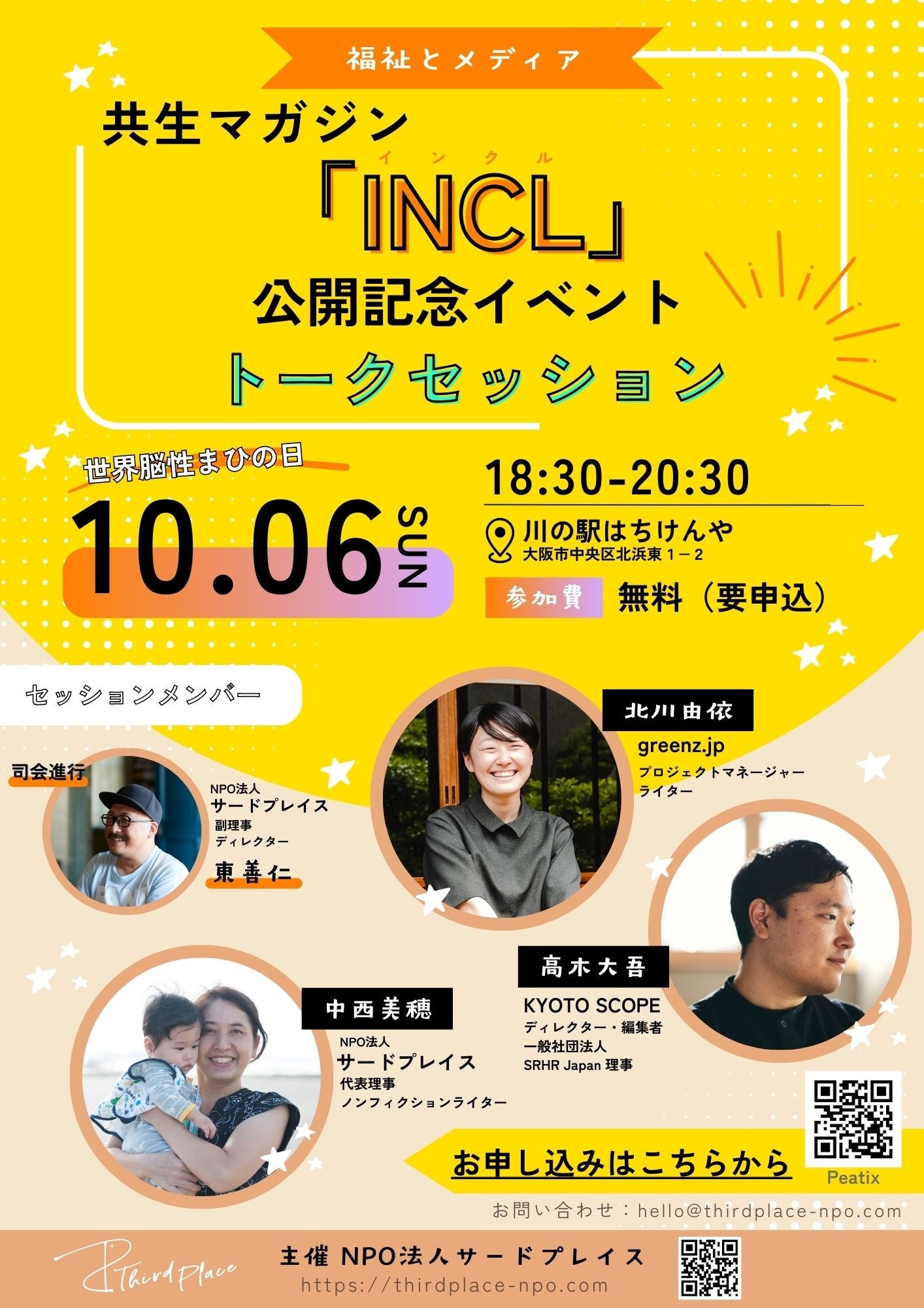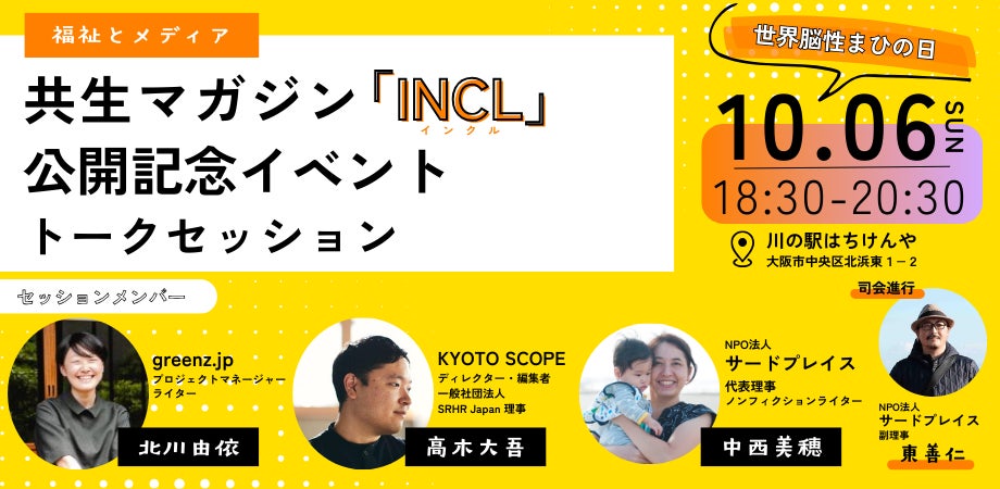 【大阪市】10月6日(日)18時半~トークセッション【福祉とメディア】共生マガジン「INCL」公開記念イベント&世界脳性まひの日イベント 主催:NPO法人サードプレイス
