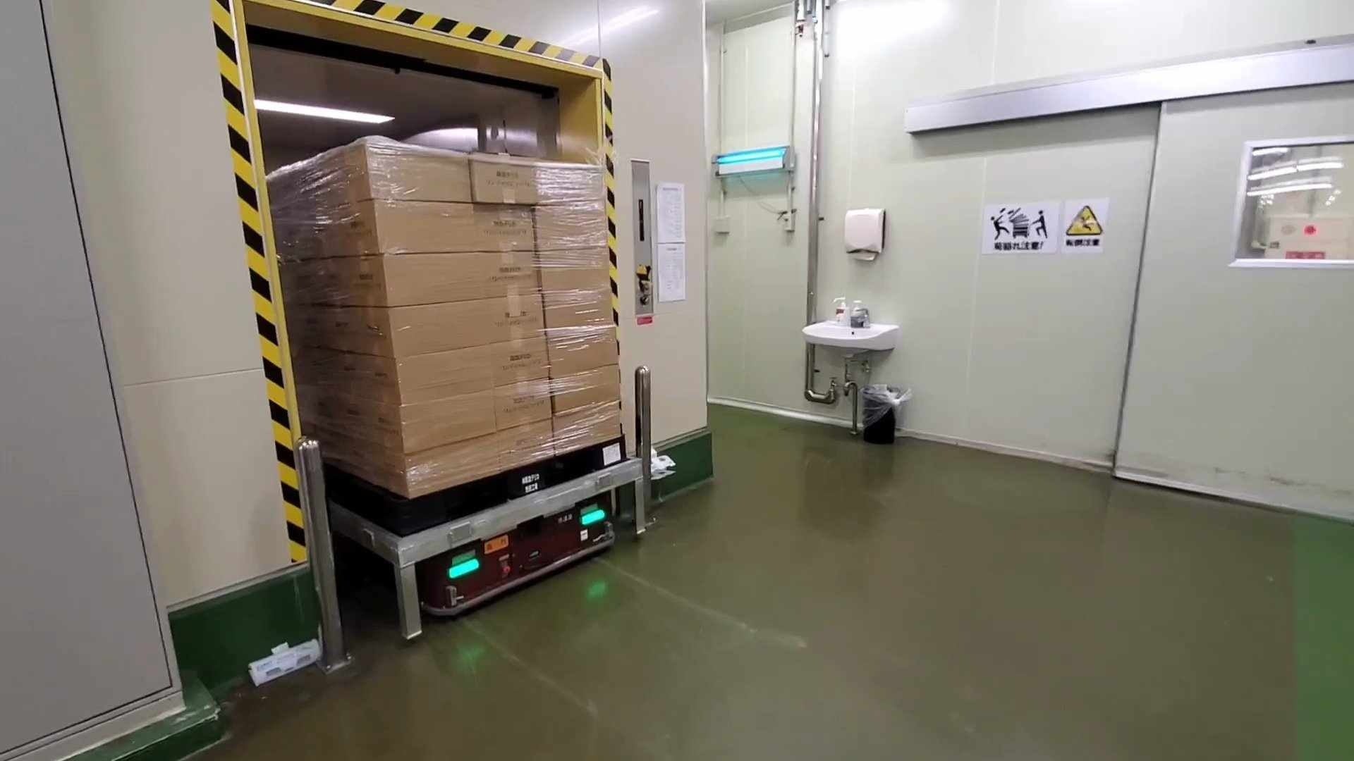 『YL-250F』は、重量物をパレットで搬送するリフトアップ型AMRです。原料等を常温帯で構内平面移動搬送するものは既にありますが、惣菜・弁当工場で最も必要とされる、エレベーター経由での冷凍庫、冷蔵庫内への自動搬送の事例はこれまでありませんでした。また、食品工場は水洗い清掃を行うため、水はけ用のスロープや段差もあり路面への対策も必要です。