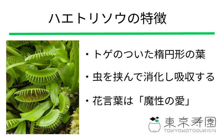 ハエトリソウ(ハエトリクサ)は食中植物の代表格です。名前や見た目のインパクトが強いことから、1回見ると目に焼きついて忘れないです。トゲのついた葉っぱで虫を捕獲し、消化し吸収するという特性を持っています。